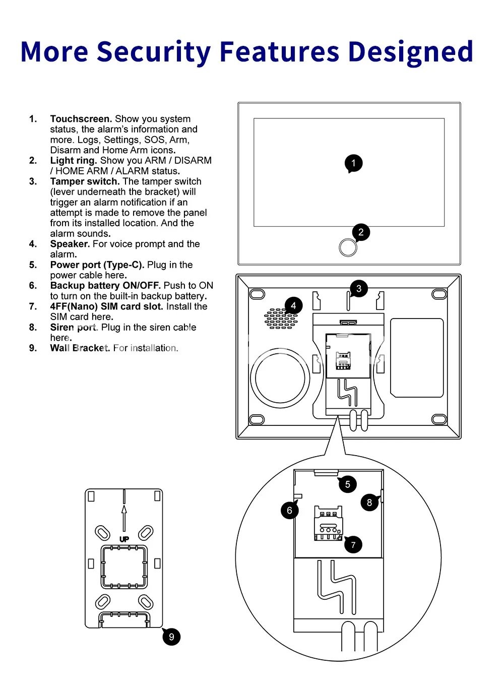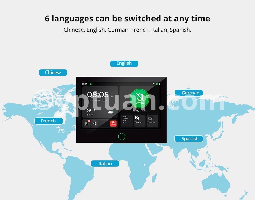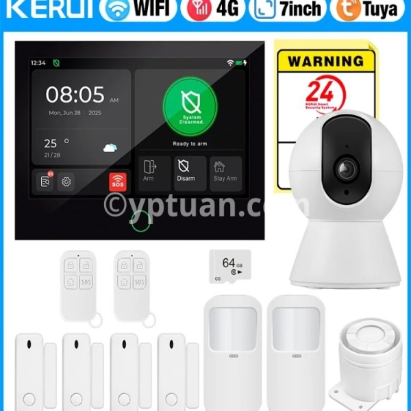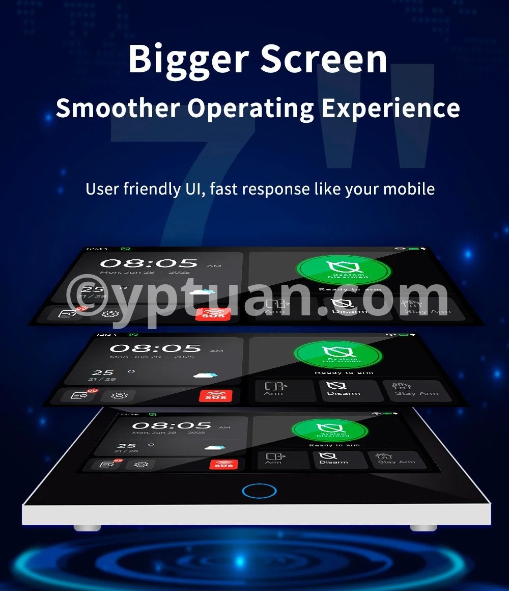 1- 7-inch large IPS touch screen. 2- Support LTE 4G/GSM/WiFi. 3- Support Tuya Smart / Smart Life APP. 4- Support Amazon Alexa, Google Assistant, IFTTT and other intelligent voice control. 5- Support 6 languages: English, German, French, Italian, Spanish, Chinese. 6- Support 100 wireless defense areas, the first 40 wireless defense areas can customize the name. 7- Support 10 remote control, can customize the name. 8- Support 5 groups of alarm phone Settings, can be set separately alarm SMS switch, dial phone switch. 9- Support 50-second alarm recording SMS 10- Support wireless sensor battery low voltage. 11- Support Doors and Windows not closed warning. 12- Support Voice operation prompts. 13- Support 5 defense modes, can be set to doorbell mode. 14- Support Telephone remote deployment, withdrawal, monitoring, intercom. 15- Support SMS remote Settings. 16- User password protection: Enter the wrong password for 5 consecutive times, and the keyboard will refuse to accept the input within 90 seconds. 17- Cellular: Cat-1 LTE-FDD B1/B2/B3/B4/B5/B7/B8/B28/B66 (for SA version) LTE-FDD B1/B3/B5/B7/B8/B20 (for EU version) LTE-FDD B1/B3/B5/B8 and LTE-TDD B34/38/39/40/41 (for C version).