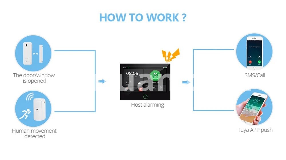 It can be linked to all Tuya solutions for smart home products, such as Tuya cameras, light bulbs, etc., compatible with google Home, Alexa.