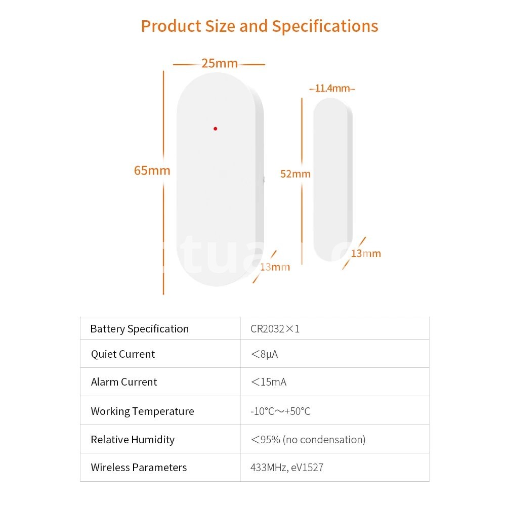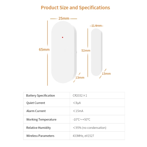 It's very simple to connect the door and window sensor to the alarm system, once paired successfully, your protected area will be protected 24/7 and you will receive instant notification of any attempted break-in. Warm notice: It is not WiFi entry sensor, needs to be connected to a security host to use. Wireless parameters: 433MHz, eV1527.