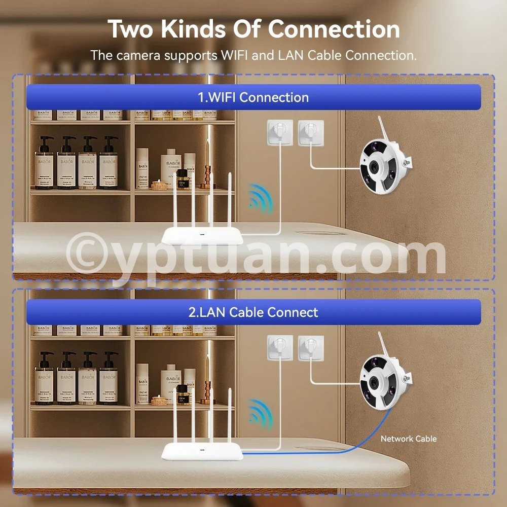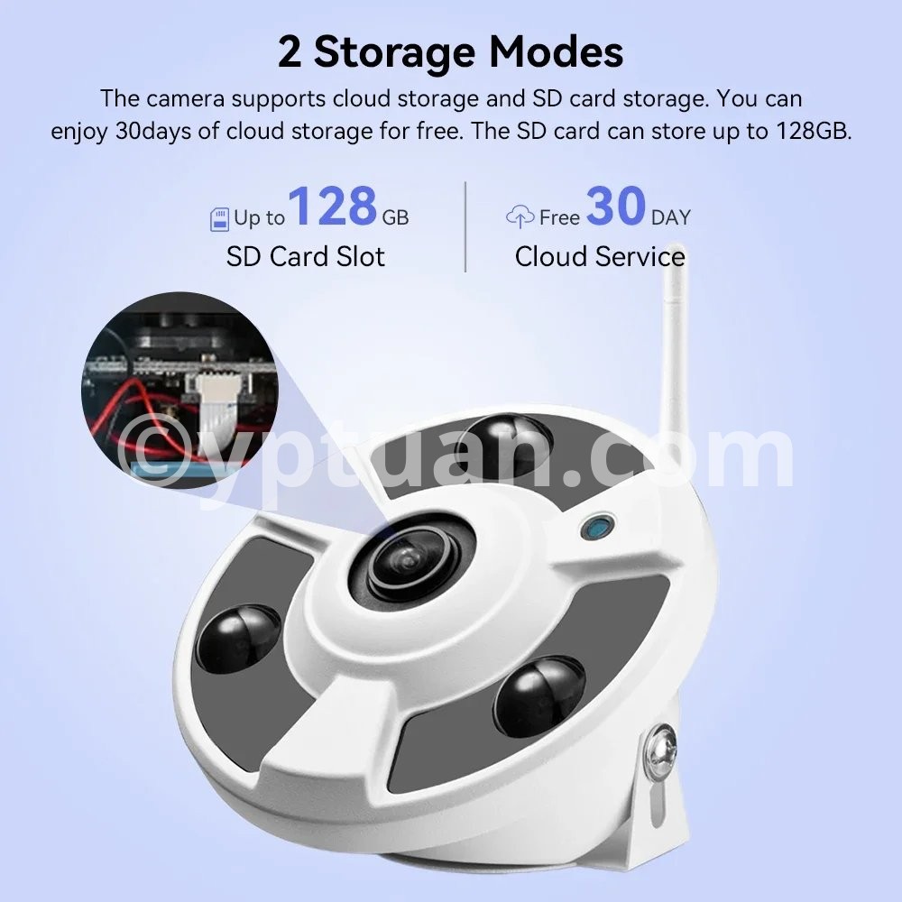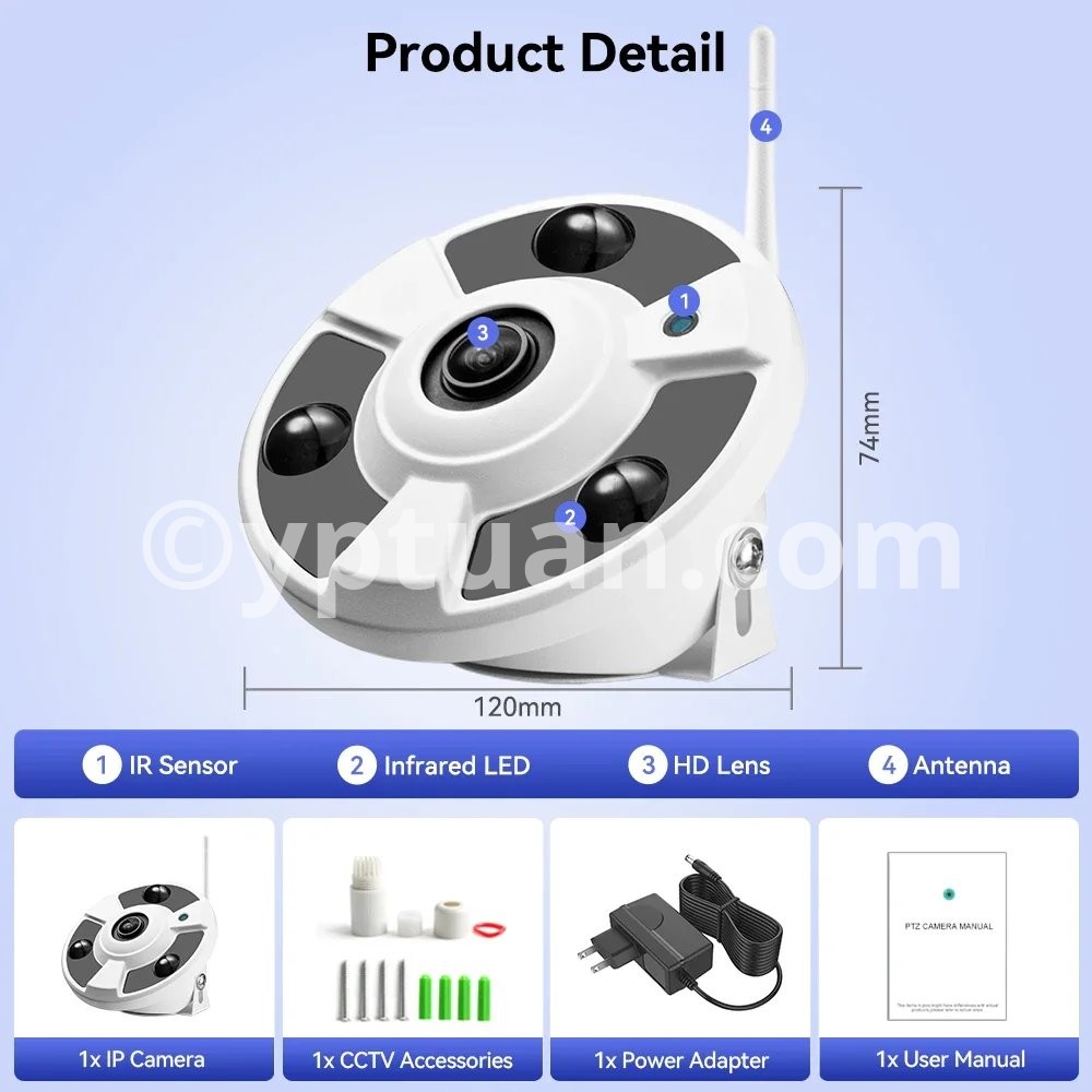 Main Features: •Effective Pixels: 2MP:1920*1080P/5MP:2592x1944P •Min.Scene Illumination:Color 0.5LUX(IR ON) •Lens: 5MP 1.7MM,180degree wide angle •System operating : Embedded LINUX Operating •IR distance:3pcs Arrray LED,15m IR distance •Video Conpression: H.265X •Recording Management:Video mode>Manual recording> time recording,>alarm recording •Recordings : SaveTF card •Network Ethernet:Ethernet (10/100 Base-T), RJ-45 connector •Wireless LAN:IEEE802.11n Standard 2.4Ghz ( Can't support 5G) •Physical properties Temperature:0°C~+55°C •Power Consumption :6W-7W •Power Supply:DC12V