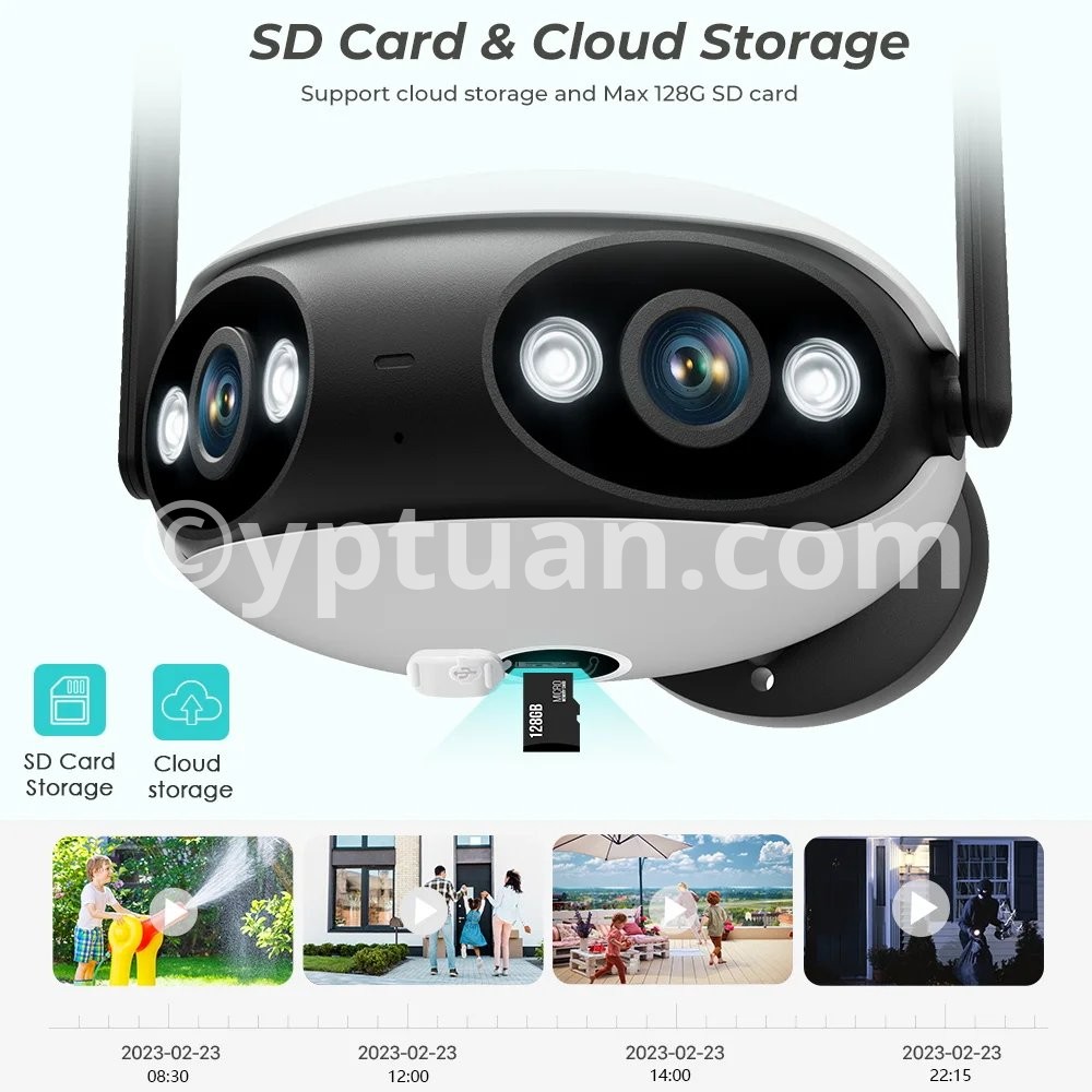 First month cloud storage and Max 128G SD card Record ,data security is more stable . If you want to keep using Cloud Service, you just need to pay for it , if you don't need to use , it will stop it automatically when you don't pay for the fee.