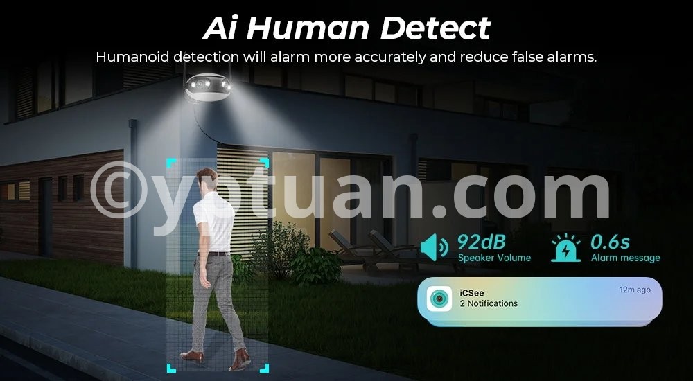 ● 8MP 4MP Resolution Option ● AI human detection Alarm ●Real-time image transmission, adaptive network; ●4 infrared LEDs + 4 white LEDs, presenting you with clear and colorful day/night images; ● 10~30 meters Colorful/Black White Night Vision ●Color mode: white LED lights up, day and night are color vision; ● Enhanced dual antenna penetration ability ● Pan 300 degree/ Tilt 100degree ● Two-Way Audio Talk Speak Real Time ● Motion Detection and Alarm Tone Function ● 2.4Ghz WiFi and Wired Connection two Mode ● AP Hotspot Mode Access ● Waterproof IP66 Use for Outdoor ● TF Card Slot Support Max 128 GB. ● Encryption security cloud storage ● Remotely View via the ICSEE App on Smartphone