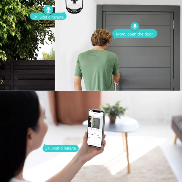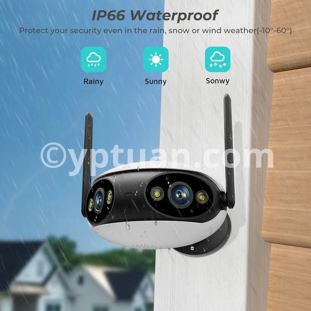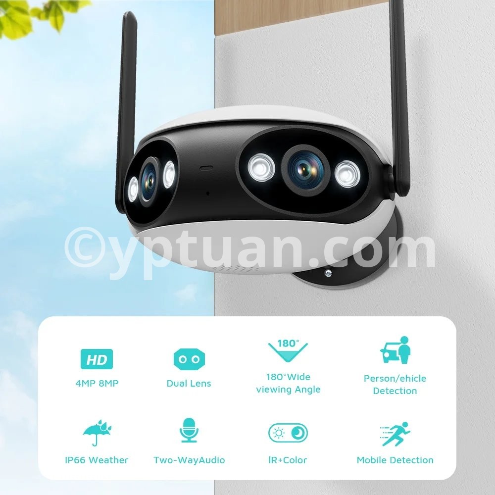① 4K 8MP / 2K 4MP pixels for you to choose ② Panoramic 180° viewing angle, you can see any corner of the front ③ Real Two Way Audio, you can talk to people in front of the phone and camera ④ Supports full-color mode, infrared mode and double-light alert mode ⑤ The camera is IP66 waterproof and anti-layer boarding grade, which can be used outdoors