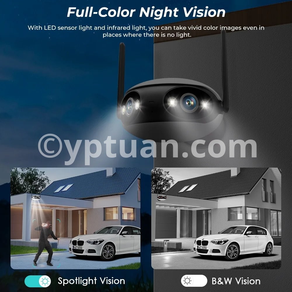 Wifi security camera equipped with 4 white LEDs and 4 high-efficiency infrared LEDs,which supports full-color mode, infrared mode and double-light alert mode (infrared night vision is displayed when no object moves, and the white light will be turned on to switch to full-color mode after motion is detected).