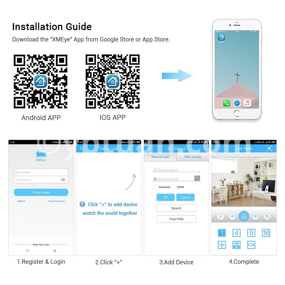 •8MP(3840*2160): NT98566+1/2.7'' SC8239 (15fps) •5MP(2880*1616): XM550+1/2.7"SC5335P (15fps) •3MP(2304*1296): XM535+ 1/2.8"SC3335 (20fps) •2MP(1920*1080): XM530AI+1/3"F37(25fps) •Minimum Illumination: color 0.1Lux,F1.2; black/white 0.01Lux,F1.2 •Advanced H.265/H.264 Video compression •Super low rate,high definition quality of image •Support 2D/3D noise reduction,digital wide dynamic •Support onvif, can work with third-part onvif nvr. •P2P,support cloud technology ,mobile phone viewing (iOS,android)”Xmeye” •3PCS Powerful IR LED 20Meters IR Distance •5MP 1.7MM fisheye lens,up to 180degree angle •Metal Housing,indoor used only. •DV12 and 48V POE optional