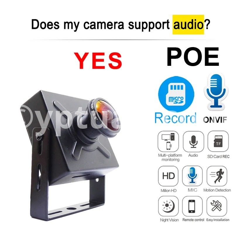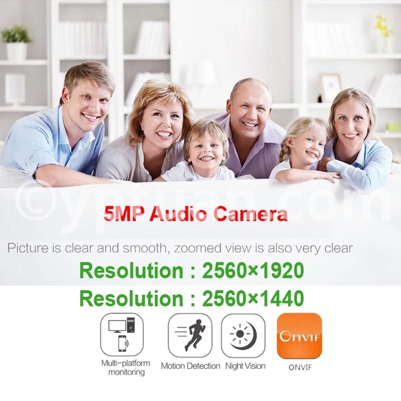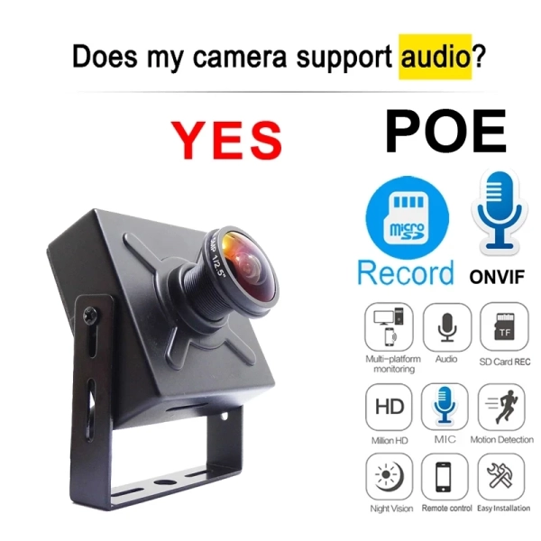 5MP Audio IP Camera (2560*1920 / 2560*1440) Audio record 1.7mm panoramic fisheye lens Support Micro SD card,up to 128Gb(Does not contain Micro SD Card); Support ONVIF,can work with Third Party NVR . Support for mobile video surveillance(iOS,android) Support Motion Detection & Email Alert Built-in microphone Remote real-time video, real-time sound Support recording Video and sound Support POE connection (optional)