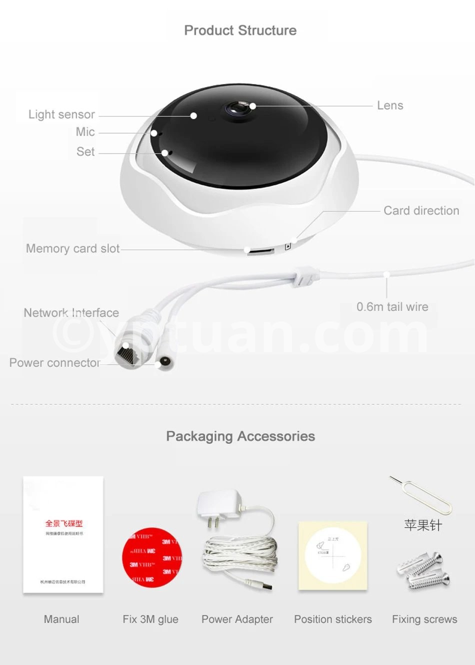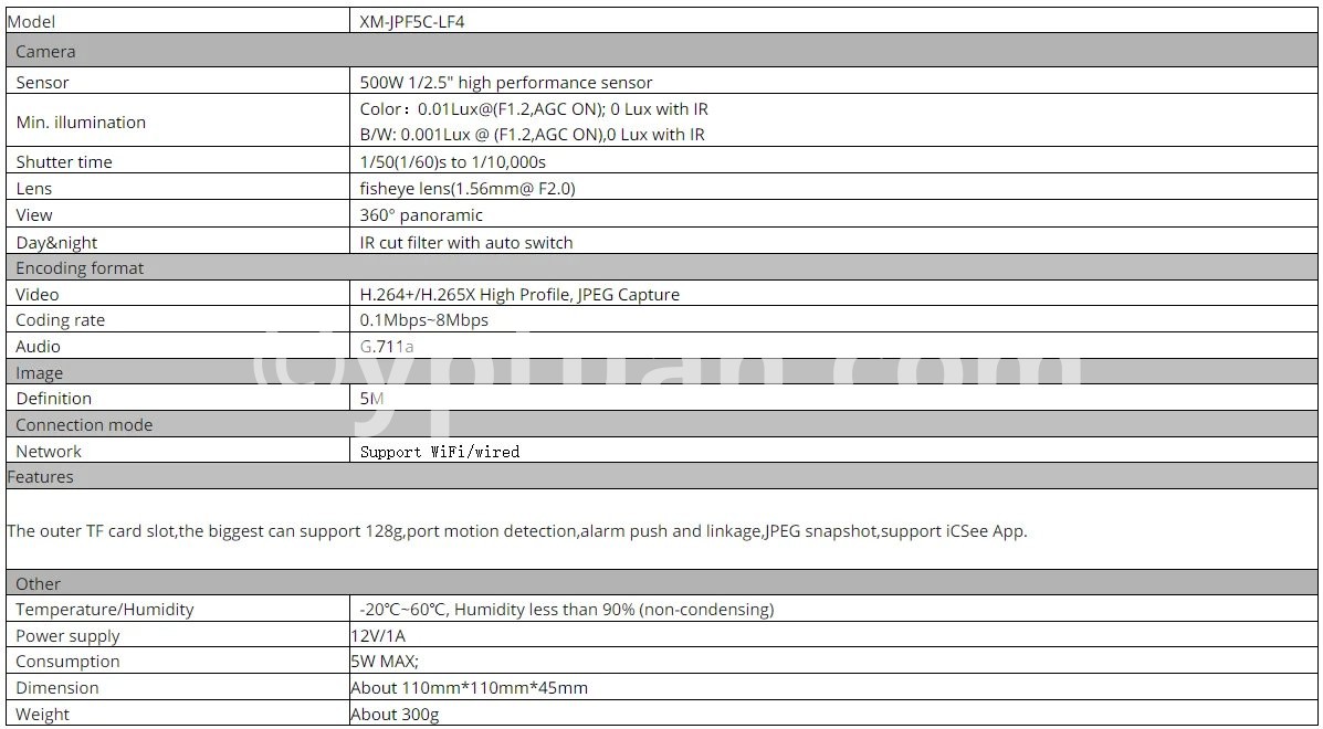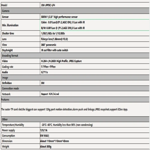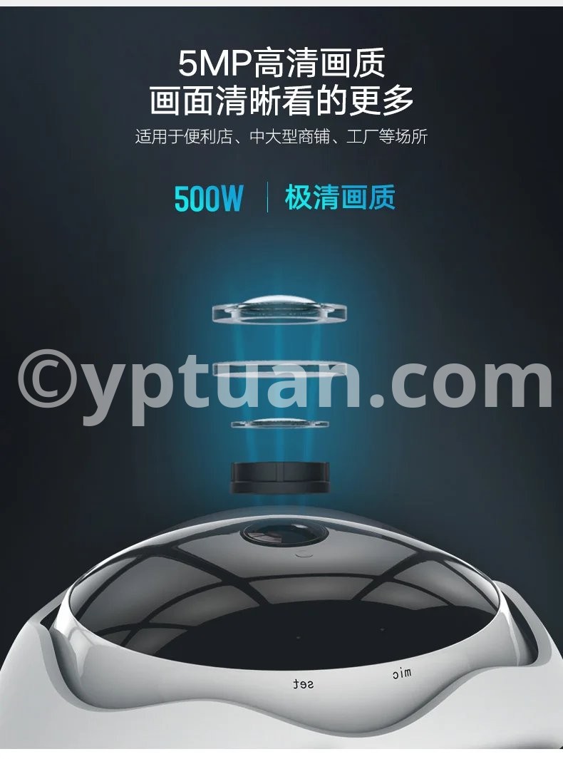 360 degrees VR panoramic view; HD 5M,Image clear,Delicate; Day/Night (Auto ICR); Mobile phone remote monitoring (iOS,Android);