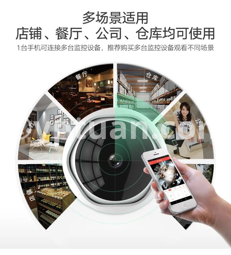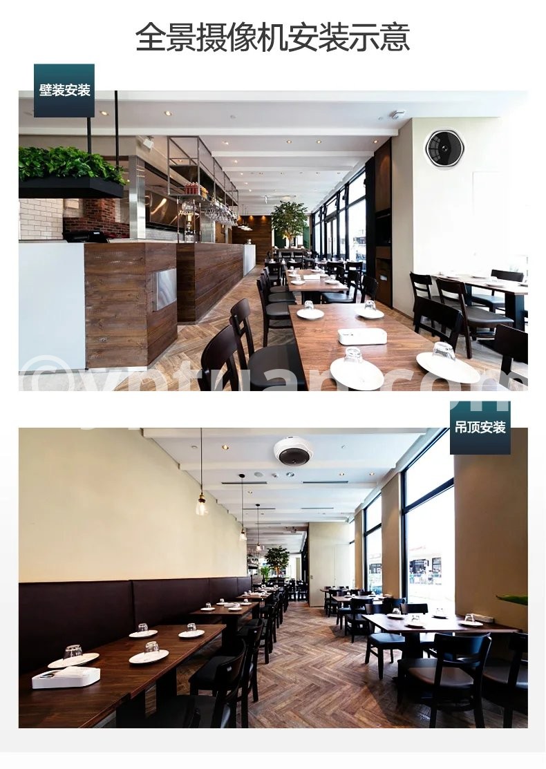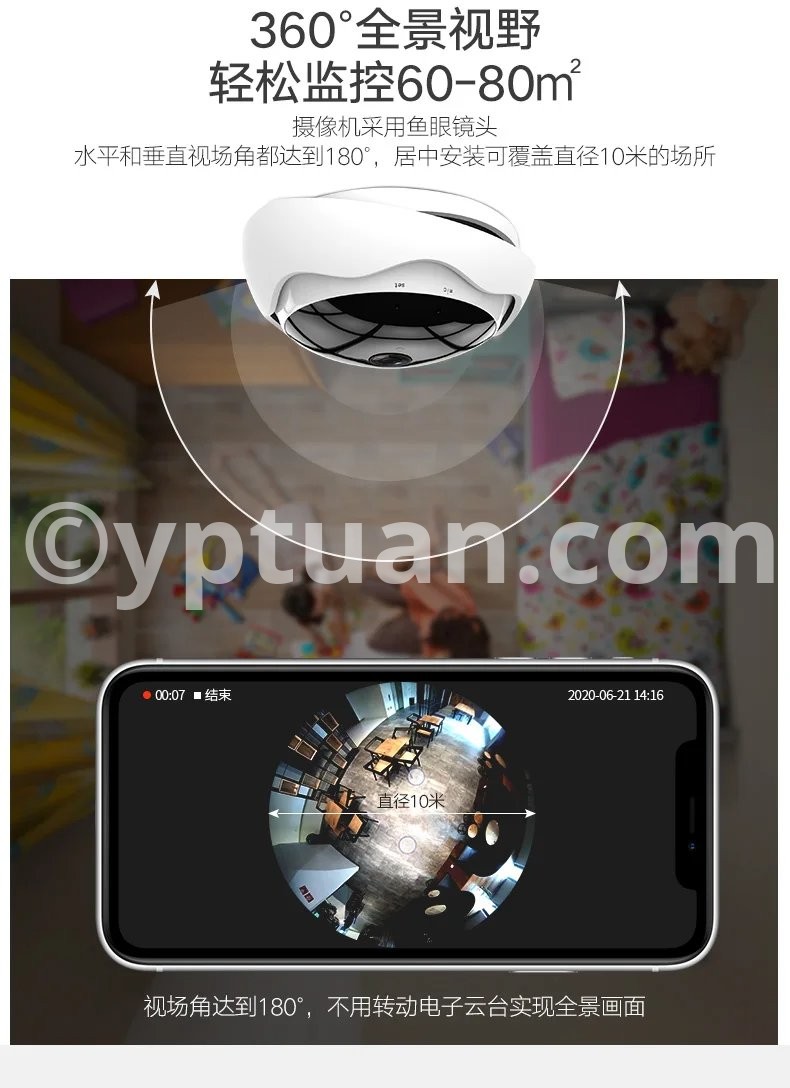 360-degree panoramic view, easily monitor 60-80 square meters The camera only has a fisheye lens, the horizontal and vertical field of view can reach 180 degrees, and the centered installation can cover places up to 10 meters in diameter.