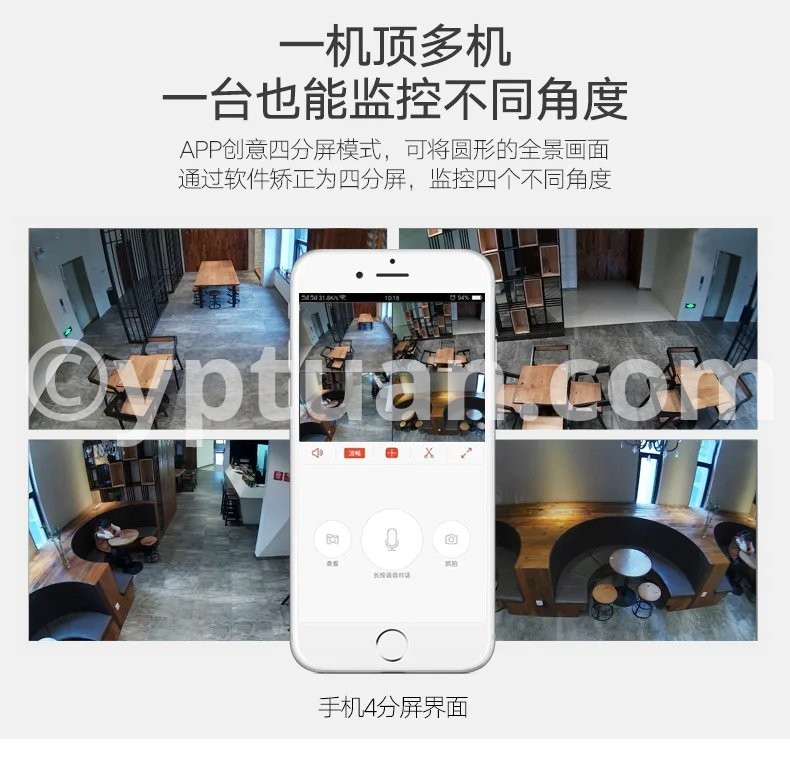 One device can replace multiple devices, and one device can also monitor different angles APP screen quarter mode, through the APP software to divide the circular panoramic screen into 4 screens, monitoring from 4 different angles
