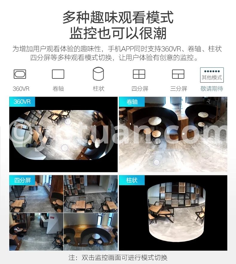 A variety of interesting viewing modes,Monitoring can also be trendy The mobile APP supports multiple viewing modes such as 360VR, scrolling, columnar quarter screen, etc., allowing users to experience creative monitoring