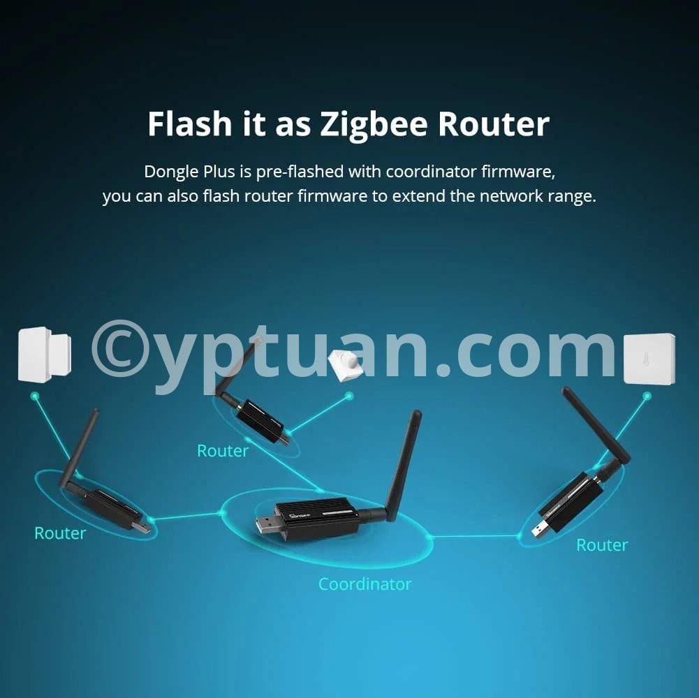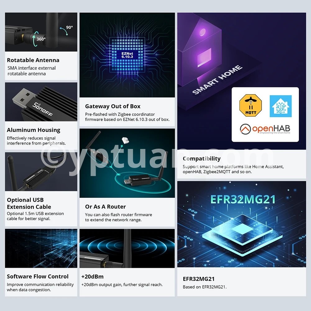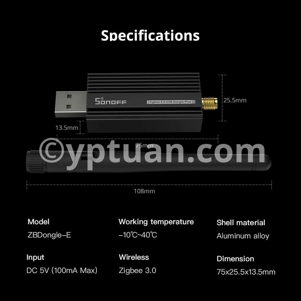 Pre-flashed with Zigbee coordinator firmware based on EZNet 6.10.3 out of box Support smart home platforms like Home Assistant, openHAB, Zigbee2MQTT and so on Based on EFR32MG21 +20dBm output gain Aluminum housing effectively reduces signal interference from peripherals Optional 1.5m USB extension cable for better signal range Note: The ZBDongle-E supports the Green Power devices, If you want to add the Hue Zigbee Green Power device, you need to switch the channel of ZBDongle-E to 11/15/20/25 at your specific application. SONOFF Zigbee 3.0 USB Dongle Plus can works with the devices below: Router: ZBMINI smart switch, S40 Lite ZB, S31 Lite ZB smart plug, S26R2ZB smart switch End Device: ZBMINI-L smart switch, SNZB-01P switch, SNZB-02P Temp. and Hum. sensor, SNZB-03P motion sensor, SNZB-04P door/window sensor