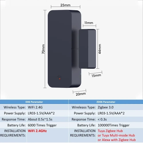 1. The battery is not included in the package. Please use LR03-1.5V alkaline batteries. 2. The product is not waterproof, Not suitable for outdoor use. 3. WiFi Version(D06) only supports WiFi 2.4GHz. 4. Zigbee Version(ZD06) only supports Zigbee 3.0
