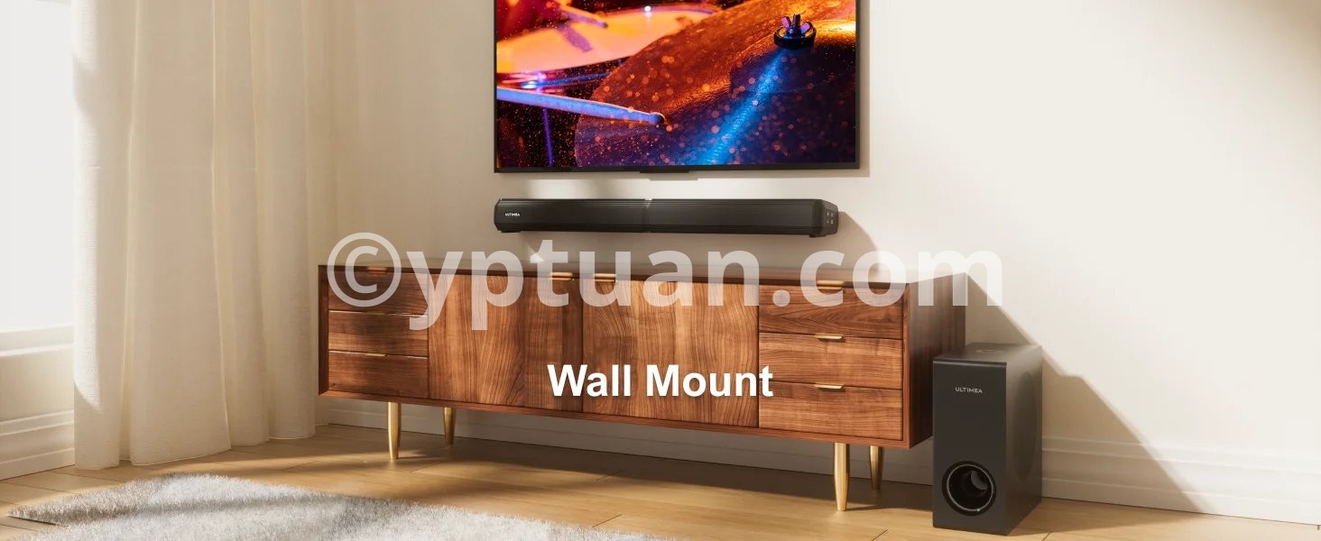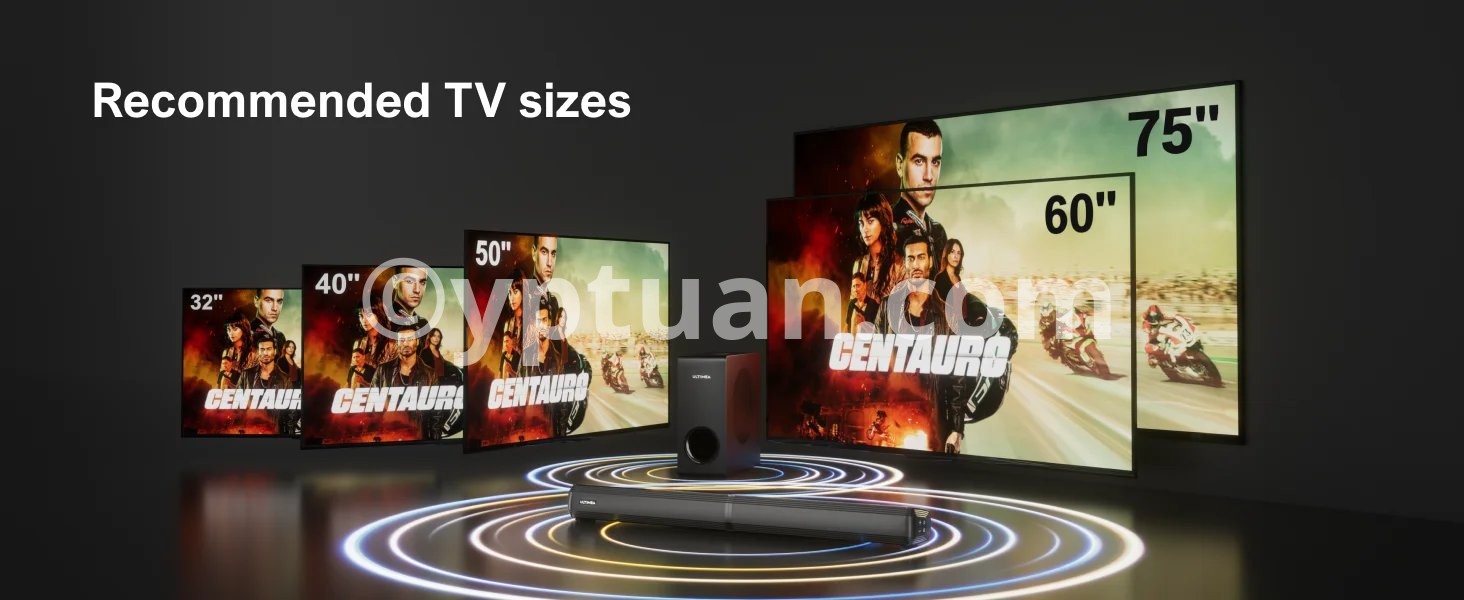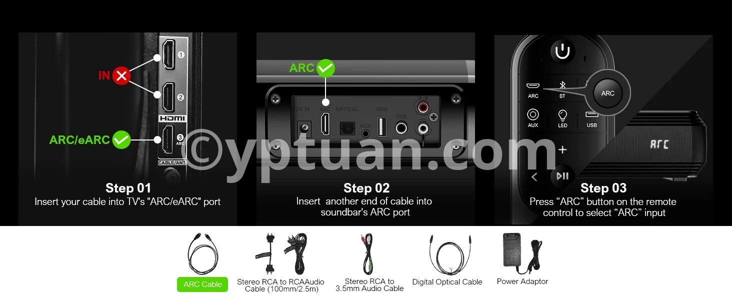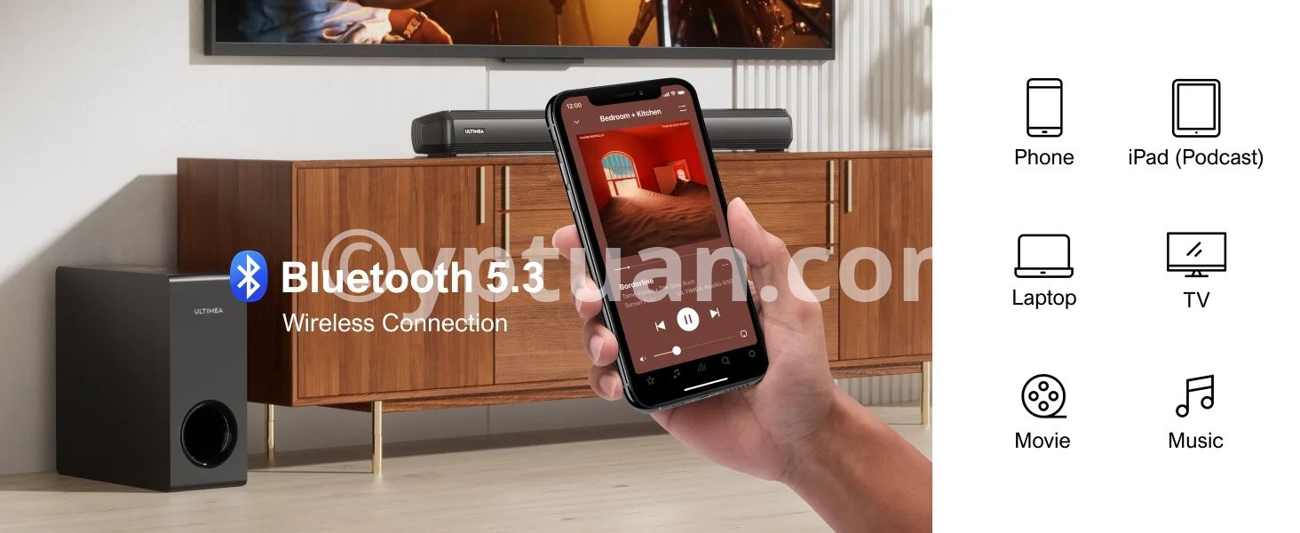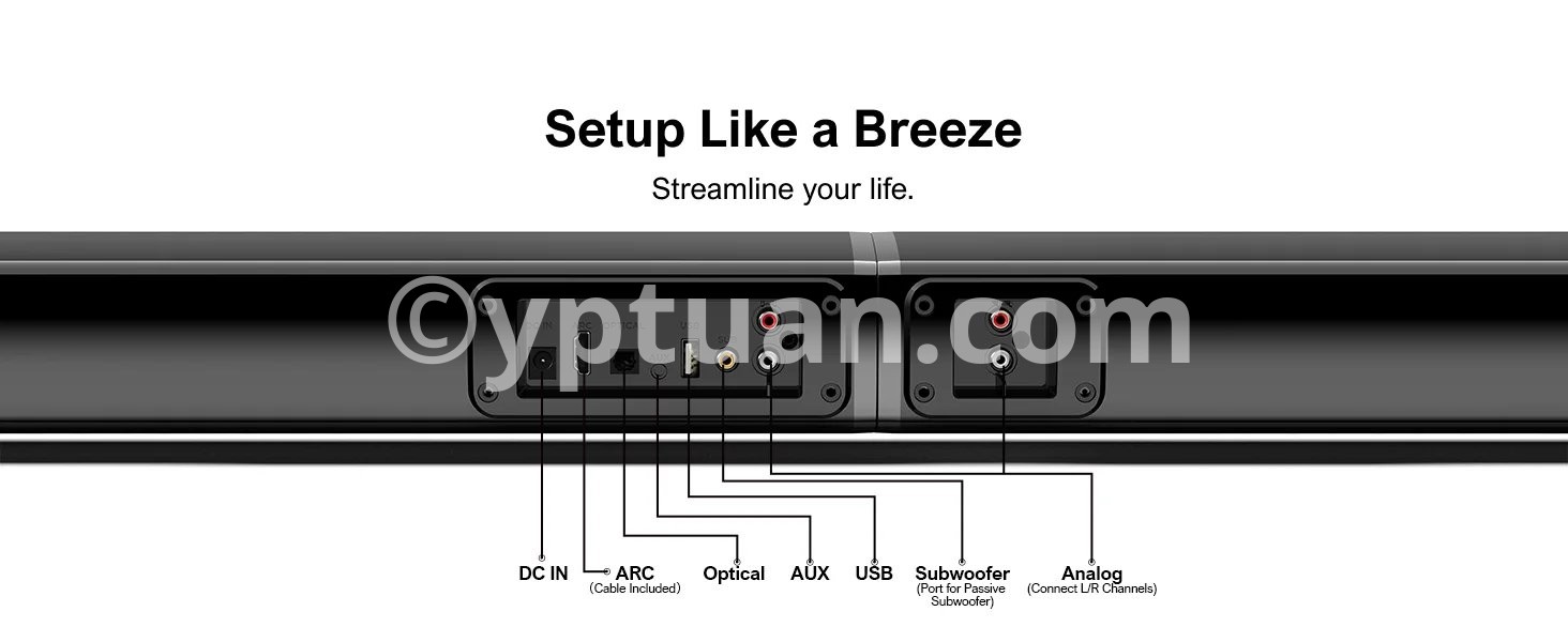 - The soundbar has wired and wireless dual connection options, including ARC, Optical, AUX, and USB ports (all cables included). Bluetooth 5.3 technology ensures faster speeds and a coverage range of up to 49 feet.