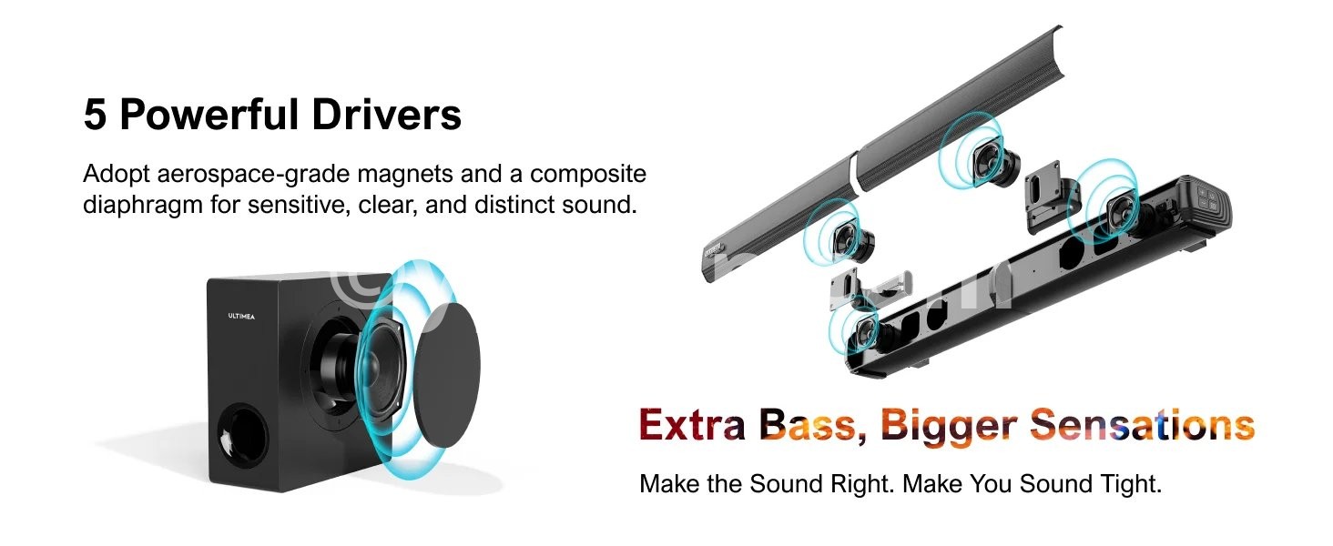 - Featuring built-in 2 tweeters and woofers, this 4.1ch soundbar for TV reproduces a balanced sound enjoys richer lows, and indulges in crisper highs. Additionally, the Apollo S50 soundbar has an extra 7.2L large-volume wired subwoofer that enables the diaphragm's amplitude to reach 15mm, achieving a more powerful bass.