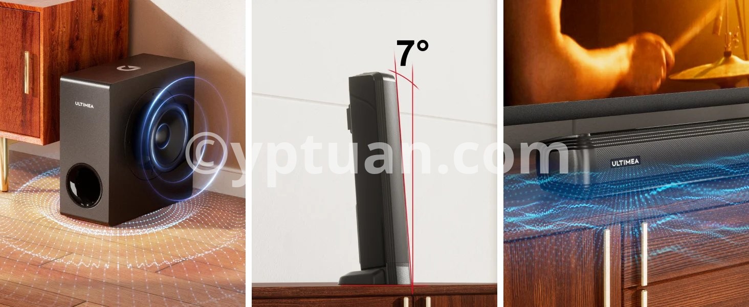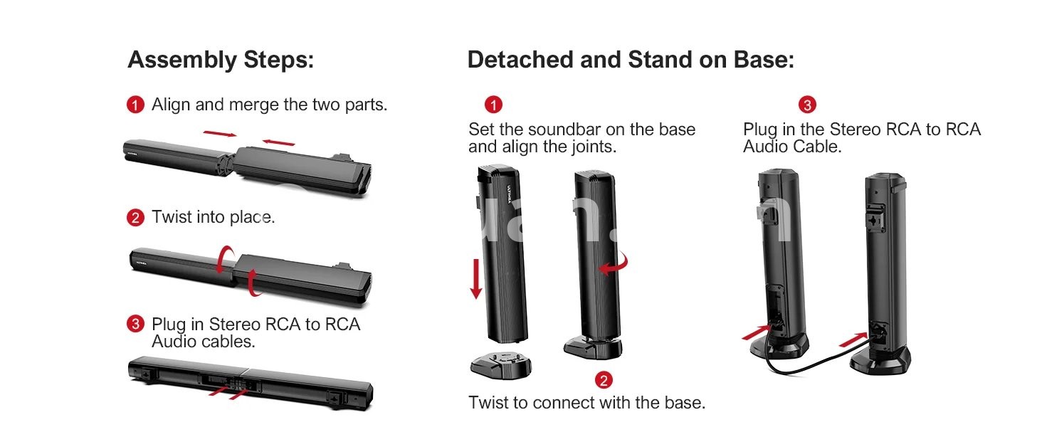 - The soundbar's detachable design allows you to assemble it in a variety of styles to fit the layout and atmosphere of your room. The split design saves space while the unique 7° tilt design enriches the soundstage with exclusive details.