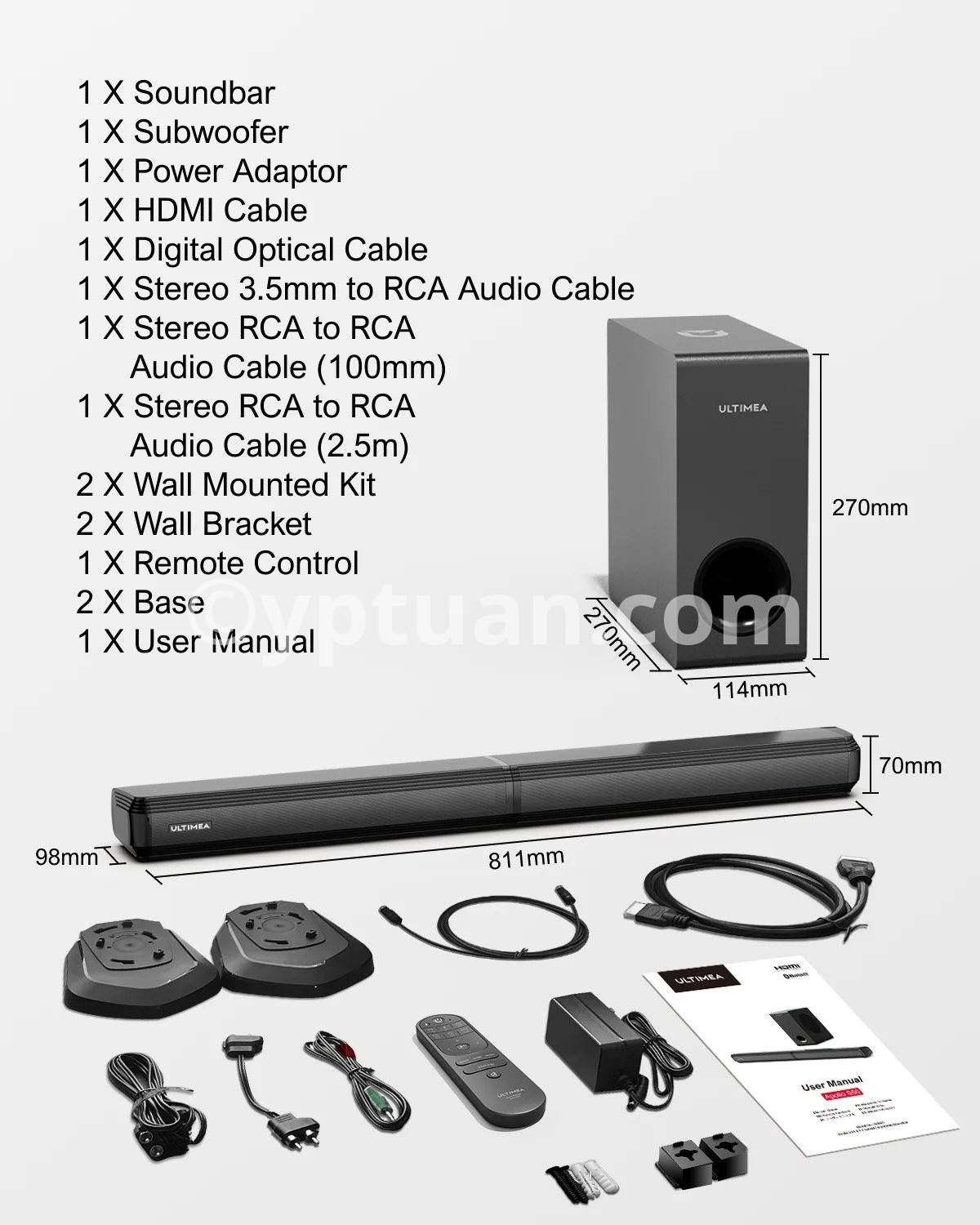 1 x Soundbar Unit/1 x Wired Subwoofer/1 x Power Adaptor/1 x Remote Control 1 x ARC Cable/1 x Digital Optical Cable/1 x Stereo RCA to 3.5mm Audio Cable 1 x Stereo RCA to RCA Audio Cable(3.9 inches) 1 x Stereo RCA to RCA Audio Cable(98 inches)