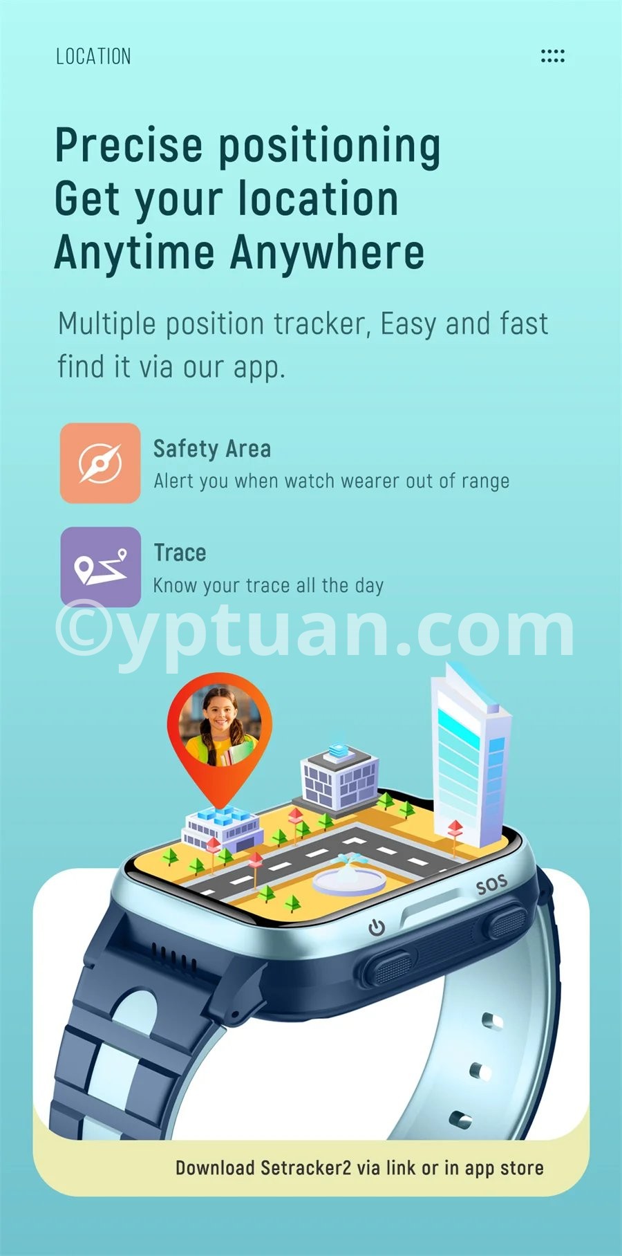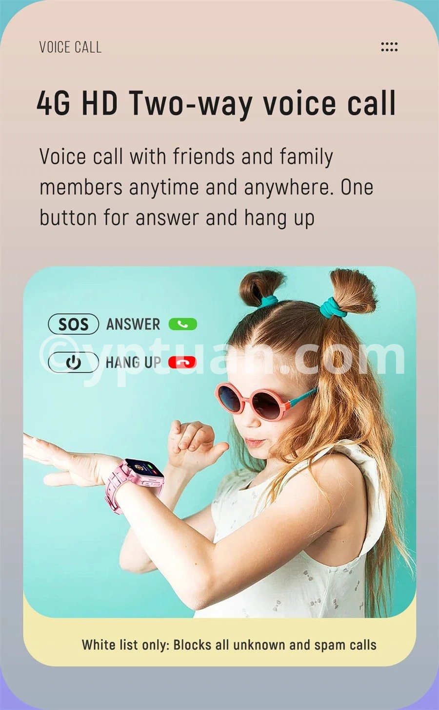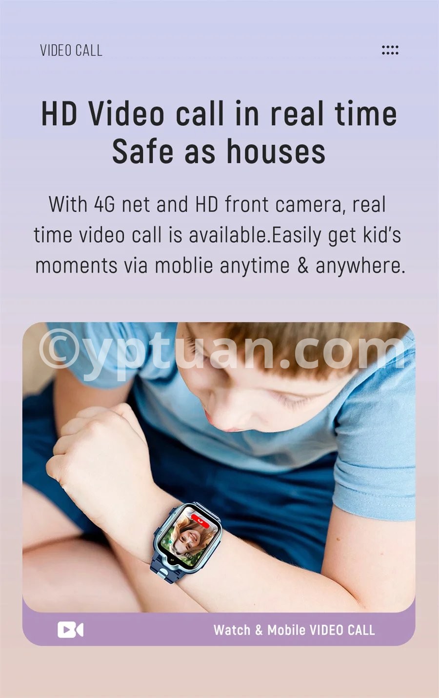 *The 4G network version:GPS+ WIFI+LBS positioning, Locate more accurate;(WIFI is for GPS location, not Internet connection) *Phone book:Setting up maximum 15 members of your friends or relatives,speed dial available. *Voice chat:Support *Communications:Two-way voice chat,video call available,spam blocker and video chat via app on mobile." *Voice chat:Group chat is available on differnet deveices (watch+moblie app) *Remote Monitor:Reply mode to set out a remote monitor(easily get the voice and background sound)" *Fence:Several fences setting available *Profiles settings:Setting up profiles of your kid(icon,name,birthday) *Notification:"Notify when reach or out of safety area , low battery and sos alrams. *Devices management":Add 1 more smart watch deveice via application *Trace:last 1 month activities trace inquiring available *Track playback:Support *WIFI+GPS+LBS range": Wifi 3-50m, GPS 3~10m, LBS100~500m *Battery Monitor:"Notify you the battery status of device Low battery notification *Time synchronization""Auto sycning with the Internet time after accessing to network" *Profiles settings:Setting up profiles of your kid(icon,name,birthday) *Video call,4G HD,G-sensor,GPS,LBS,AGPS ,AGPS,Class 12,Handfree,Ringtones,Voice chat *GPS+LBS range:GPS 3~10m, LBS100~500m *Remote monitoring: support the callback mode remote monitoring, you can clearly hear the child's voice remotely
