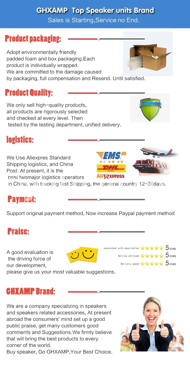 Brand:GHXAMP,Price for 2pcs. The product is made of wood with two pieces of wood, and the wood may have color difference,andinside have the Crossover Capacitors.Can Direct connect amplifier. Function: This ultra-high speaker are mainly Used for the Tweeter Compensation, for the high volume sense of lack, bleak, poor performance has a magical effect, especially Suitable For Full-range Speaker Treble Compensation. After the installation of the treble, you can immediately feel the sound field of the wide and deep and layered feel better, the sound field has become lively, treble delicate sense of the air and the ductility of the slightest ear, the sound details more rich, so you Never tired of listening' Announcement: 1. Have full-range speaker of the friends must be a pair of ultra-high tones Speaker 2. like tweets and ultra-treble friends must be a pair of ultra-high tones Speaker 3. Crossover speaker treble poor performance, the dark must be a pair of ultra-high tone Speaker 4.KTV speaker treble and voices do not clear the need for a pair of ultra-high tones Speaker The maximum diameter of the drum is 85MM, the length is 92MM. Can be placed on the sound box, modeling novel, creative infinite like a work of art to add vitality to the home. CNC machine body shape, and then fine artificial grinding, time-consuming, high cost! This is the perfect combination of high technology and craftsmen spirit. Dome of the top of the film Treble: treble unit Replay music treble smart, delicate and soft, with a good natural expression, it is necessary to listen to the shortcomings of the upper limit is low, can do 20KHZ has been very good, so the market Used to make very high treble. We have developed this exclusive neodymium wire wax treble, the use of high-performance neodymium magnetic, after the steam cavity design, high-quality silk film measured upper limit of 25KHZ. Of course, many high-sounding banners on the market can reach 30K, 40K, and do not tell the authenticity and hearing resistance, the upper limit of human hearing is 20KHZ, but enthusiasts can feel higher than the hearing limit frequency response, if higher than 30K It is really ultrasonic, and perhaps only the bat was feeling got. So 25KHZ is the ultra-high tone of the gold frequency response, the key is the sound quality and sense of tolerance, put aside the listening degree to talk about parameters are meaningless. Inside Super tweeter Speaker : Rated power: 15W Max power:30W Impedance: 8OHM Sensitivity: 91DB Panel material: engineering plastics Effective frequency: 4.5KHZ-25KHZ Panel Diameter: 70MM Magnet material: neodymium magnetic Seismic material: natural silk Net Weight:388g/PCS Package included: 2x Solid Wood Tweeter Speaker with 100cm wires