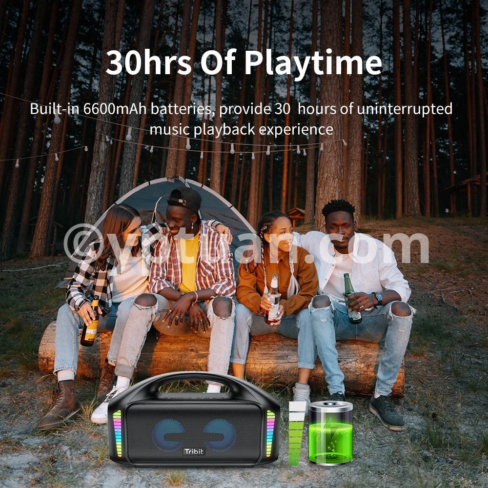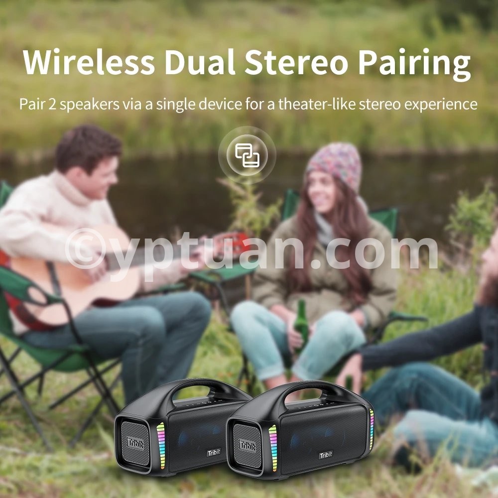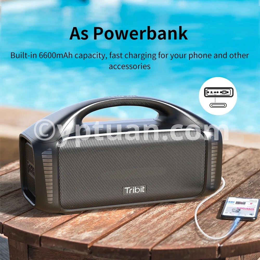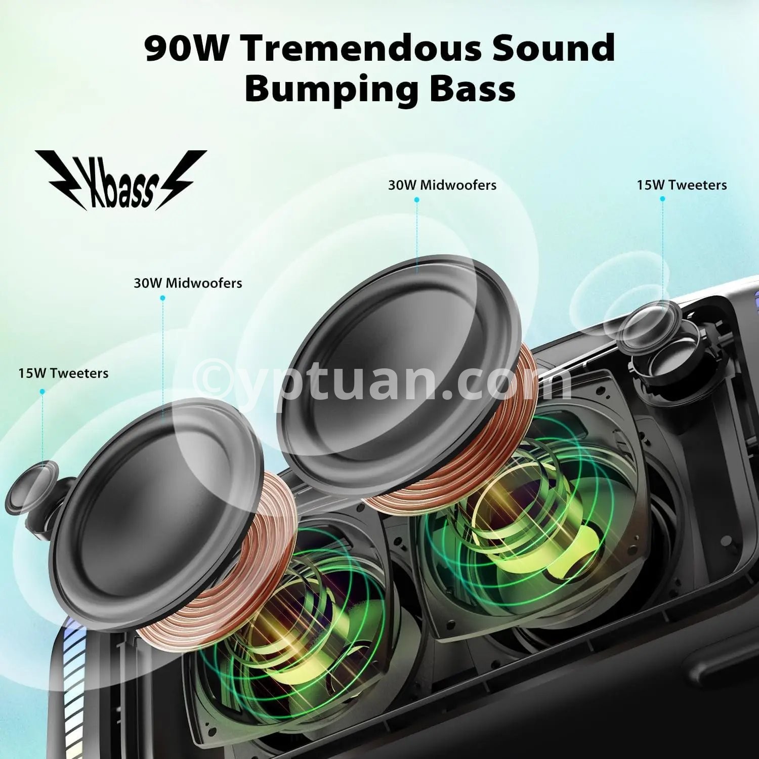 With 2x 30W woofer + 2x 15W tweeter, Providing a distortion-free, rich, and balanced sound, the Tribit StormBox Blast is the powerful 90w portable speaker you need at your party. Press the XBass to pump the bass and feel the body-shaking experience of the StormBox Blast.