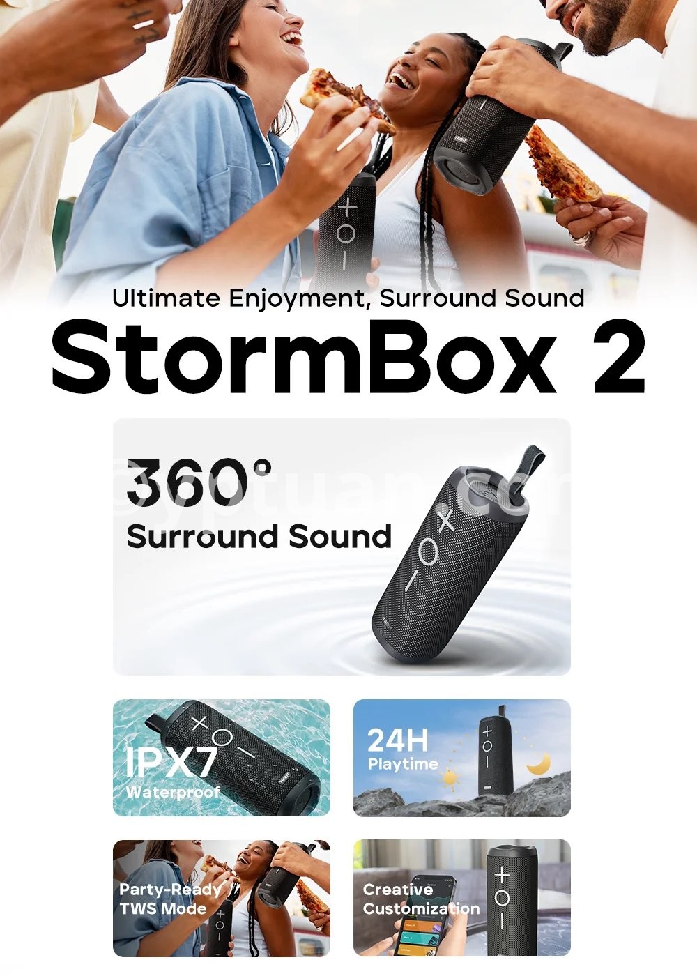 ● 【360° Surround Sound】Immerse yourself in powerful 360° audio with our Bluetooth wireless speaker, delivering 34W peak power. Equipped with two 48mm full-range drivers, they ensure crystal-clear sound quality. ● 【Ultra-Long Playback Time】Powered by RunStretch technology, our portable outdoor speaker offers an impressive 24-hour playback time, ensuring the enjoyment of music all day and night without interruption. Plus, with the latest Bluetooth 5.3 technology, you can listen from up to 150 feet away! ● 【Party-Ready TWS Mode】Take your parties to the next level with our linkable Bluetooth speakers. Pair two StormBox 2 speakers for a rich, immersive sound experience, perfect for indoor and outdoor gatherings, enhanced by XBass technology. ● 【IPX7 Waterproof】Built to withstand various weather conditions, our wireless speaker is IPX7 waterproof, making it ideal for poolside parties or patio relaxation, whether it's scorching hot or pouring rain. ● 【Creative Customization】Personalize your music experience with the DIY EQ mode in the TRIBIT App. Choose from six scenes to tailor the sound to your preferences and needs, creating the perfect ambiance for any occasion. ● 【Ideal Gift】You will get: TRIBIT StormBox 2 wireless speaker x1, USB cable x1, user manual x1. Whether you're hiking, camping, fishing, or simply relaxing at home, it guarantees a delightful experience—a perfect gift choice for birthdays, Christmas, or family gatherings!