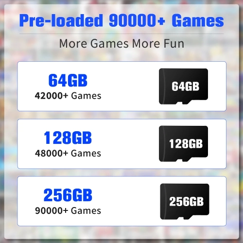 64GB game memory card: 40000+ Games 128GB game memory card: 69000+ Games 256GB game memory card:90000+ Games