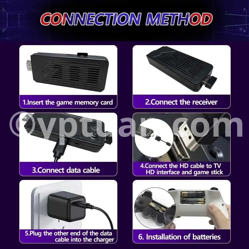 Note: Please be sure to use a normal 5V1A charger to power up the Game Stick, please do not directly plug the charging cable into the TV to power up the Game Stick, otherwise it will cause the game files to be corrupted and lost and can not be read normally.