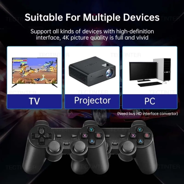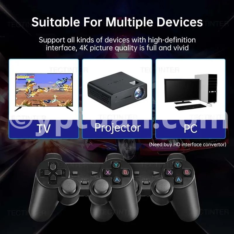 Equipped with two 2.4G wireless game controllers. Support up to 4 players at the same time, you can remotely control and enjoy the game on the sofa with your family or friends.