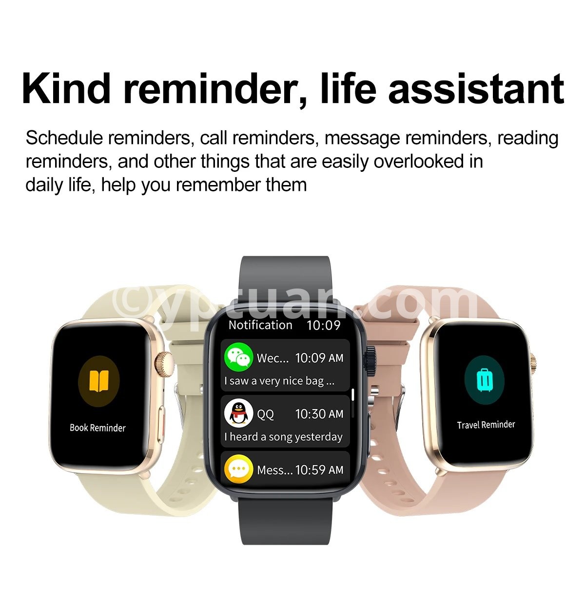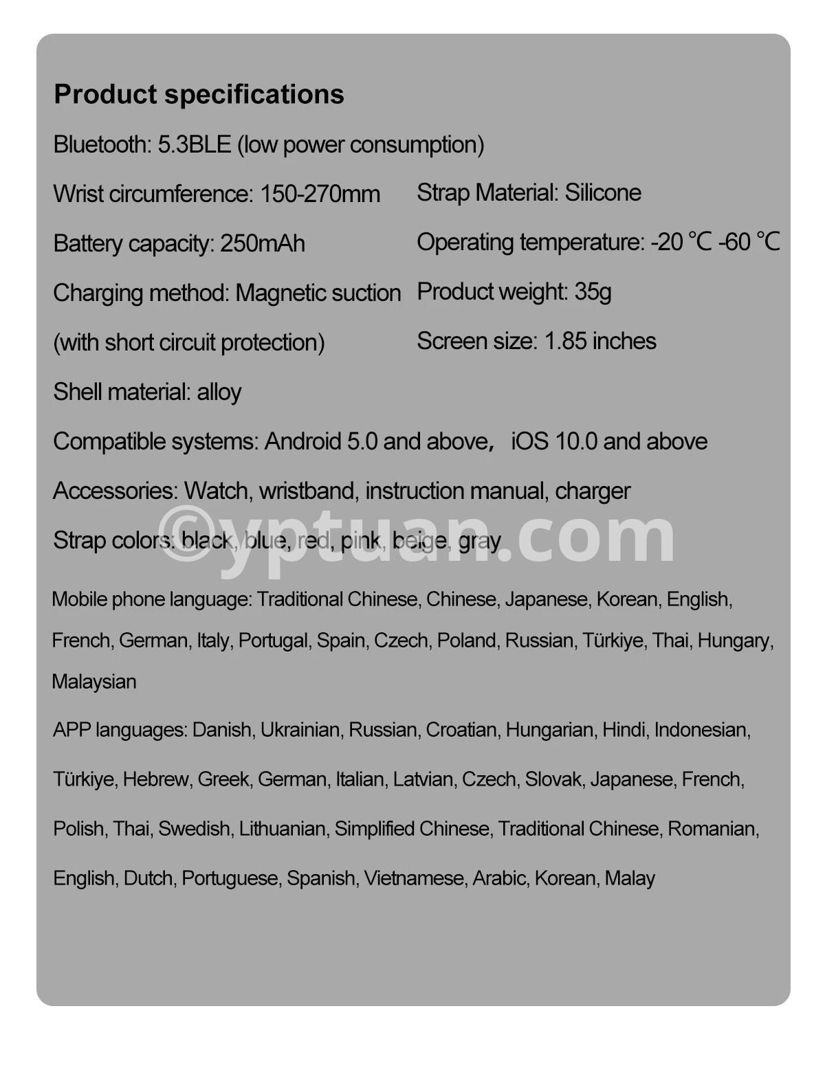 1. Product model :T92 2. Product size:273*37*11.4mm 3. CPU:Realtek 8762D+AC6963A 4. Gravity sensor:ST8321 5. ECG chip:GH 3228 (high-precision electrocardiogram HR V) 6. Heart rate and blood oxygen chip: OSRAM: SFH2703 7. BT:Bluetooth LE 5.3 8. LCD:1.85-inch high-resolution 240*284 AMOLED full touch screen 9. TP:Full screen touch control, mobile app control 10. Motor :Support 11. Charging mode magnetic charging 12. Water proof:IP68 waterproof 13. Battery capacity :250mAh high-density polymer lithium battery 14. Water proof:Alloy+stainless steel+ECG glass+AMOLED high-definition screen 15. Product color matching: 1. Body color: rose gold, black and silver. 2. Band color: beige, pink, black, blue, red and gray.