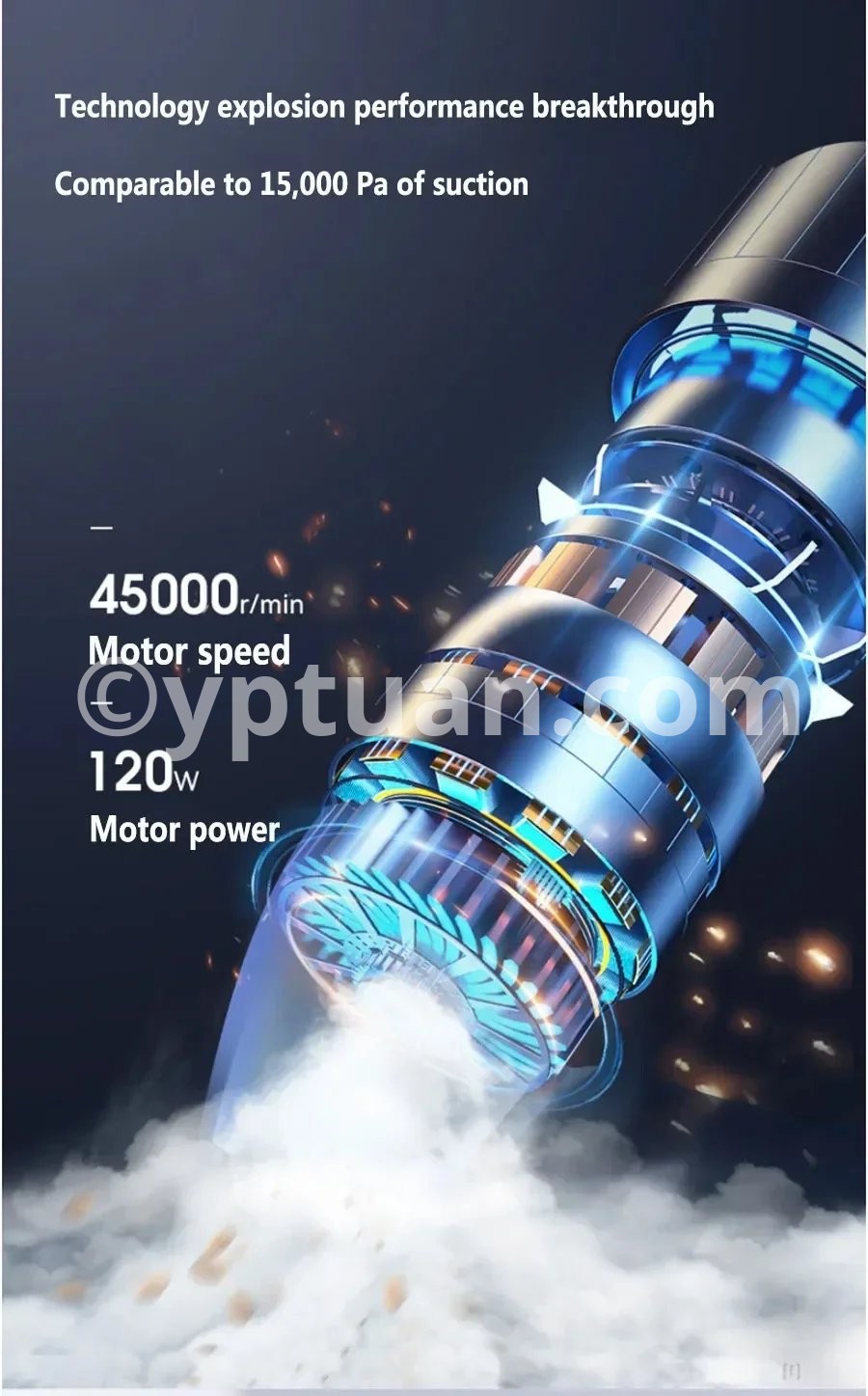 Comparable to 15,000 Pa of sucion 45000r/min Motor speed ----------- 120W Motor power