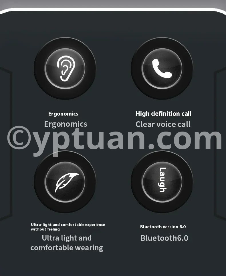 1. Stable Bluetooth 6.0 connection: Equipped with the latest Bluetooth 6.0 technology, ensuring a more stable and anti-interference wireless connection, reducing signal loss and disconnection during use, and providing a smooth audio experience. 2. Waterproof sports earphone: Featuring IPX7 waterproof and sweatproof performance, it can effectively resist the erosion of sweat and rain during intense sports such as running, fitness, and cycling, making it suitable for various sports scenarios. 3. Ergonomic non-in-ear design: Adopting an ergonomic non-in-ear wearing structure, which fits the contour of the ear canal without entering the ear, avoiding discomfort caused by long-term in-ear wearing, and ensuring a secure fit that is not easy to fall off during movement. 4. Clear voice call microphone: Built-in high-sensitivity noise-canceling microphone, which can effectively filter out environmental noise during calls, ensuring that the caller's voice is clear and audible, and improving the quality of communication.