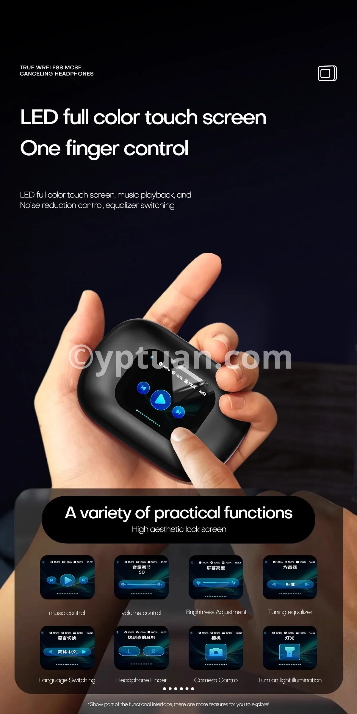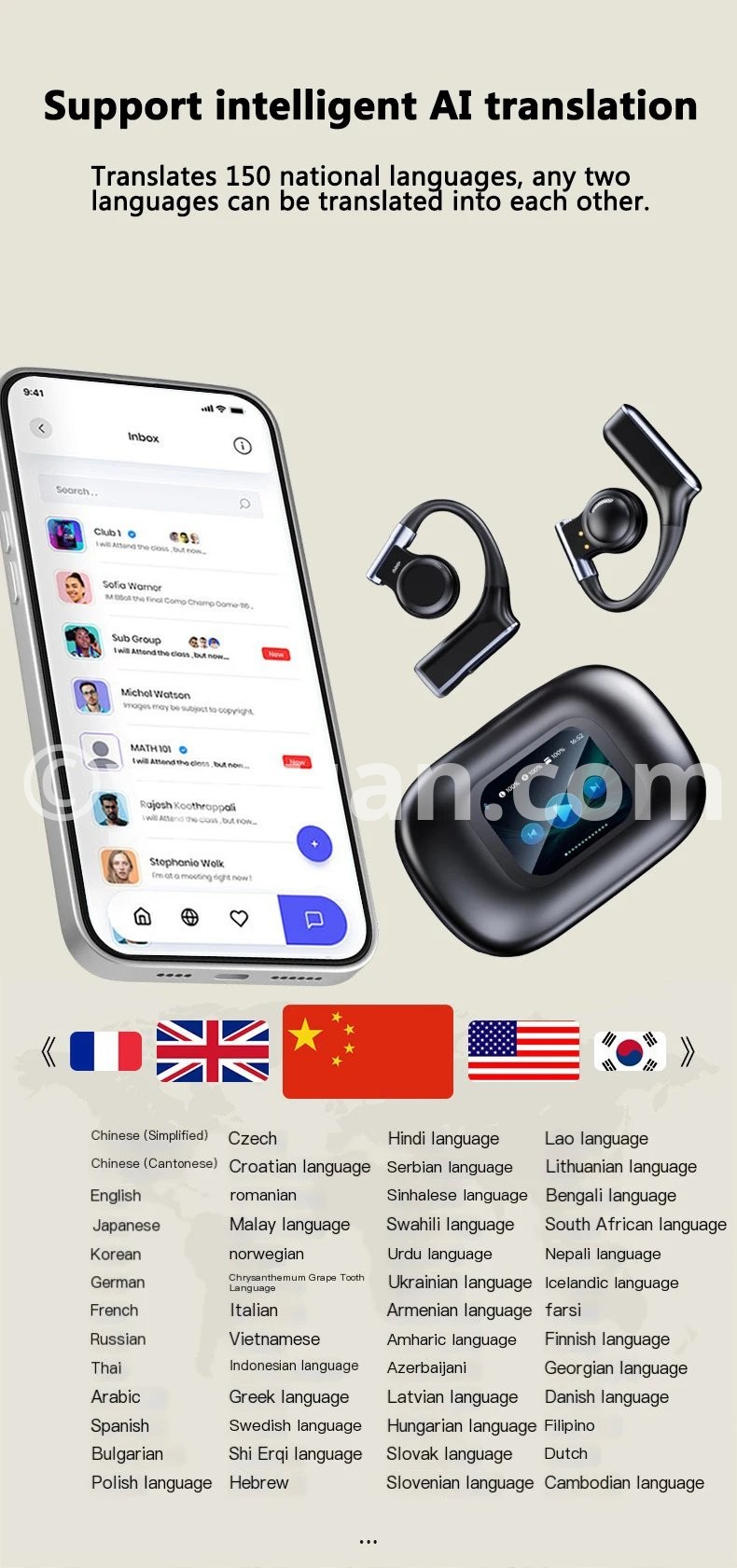 Support 150 languages Simultaneous interpretation.Through the screen of the charging case, you can control headphone settings, manage calls and playback, control audio settings and battery level, and set alarms without taking out your phone. Enjoy a truly seamless experience.
