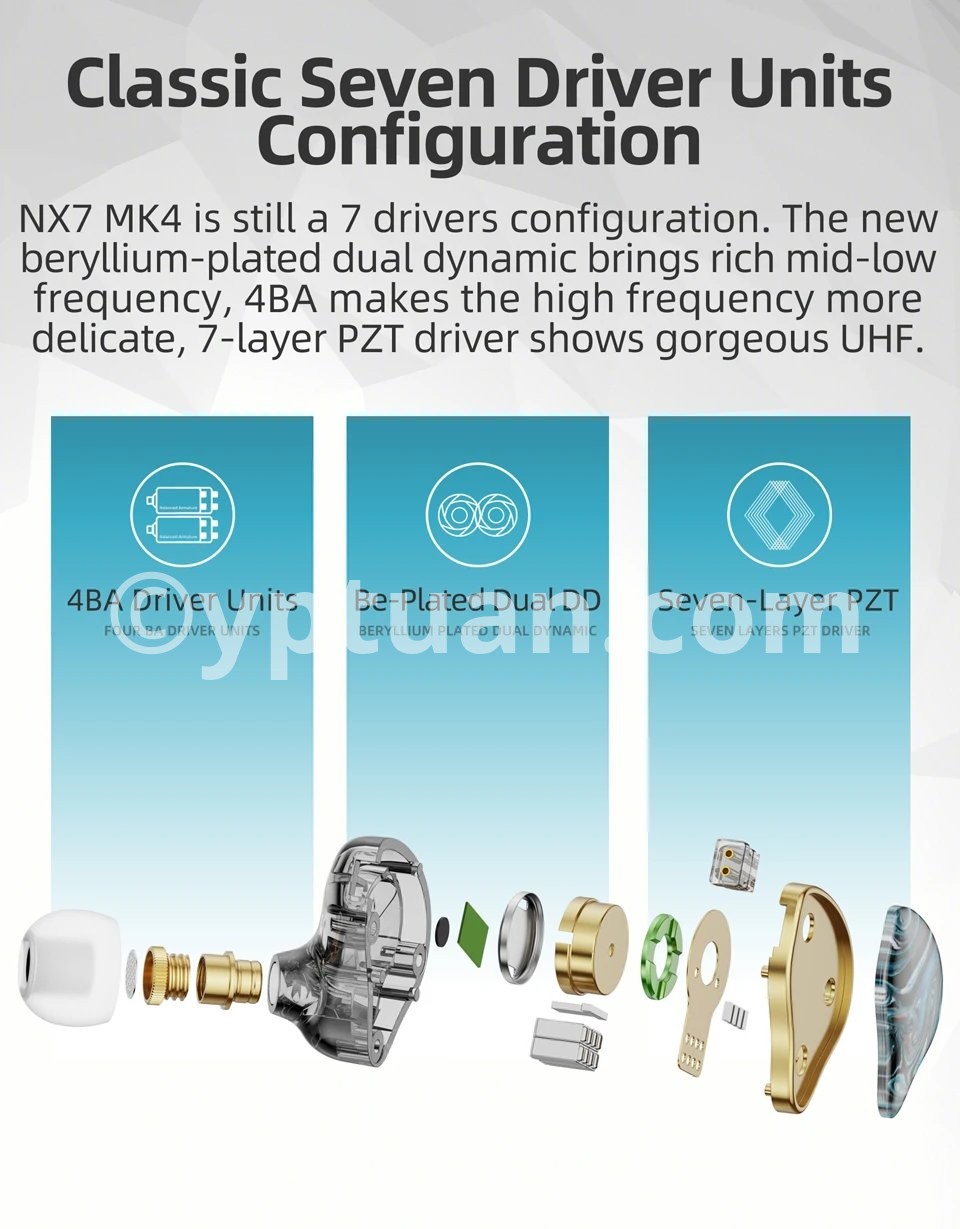14.Driver unit:4BA+10mm Beryllium Plated Composite Dual Dynamic+Seven Layers PZT Driver, Hybrid 7 Units