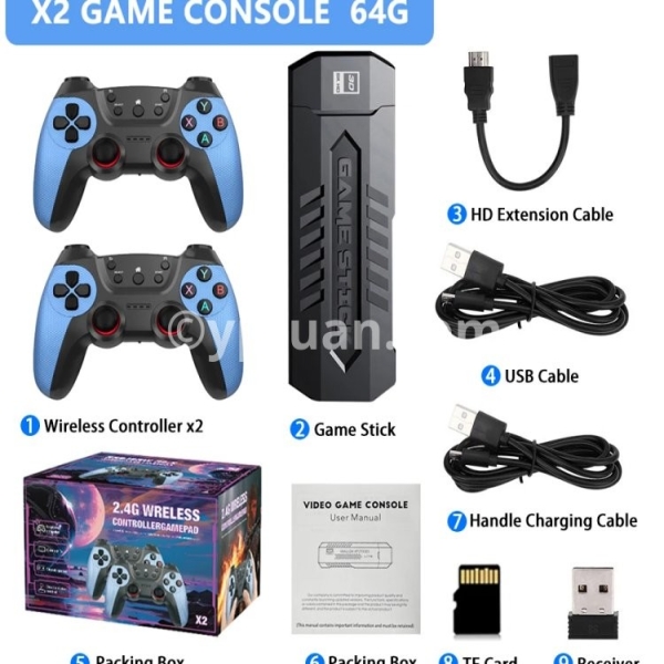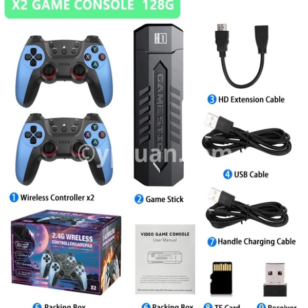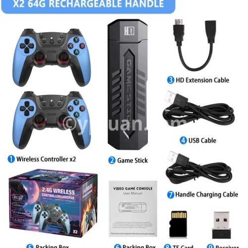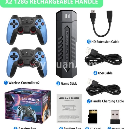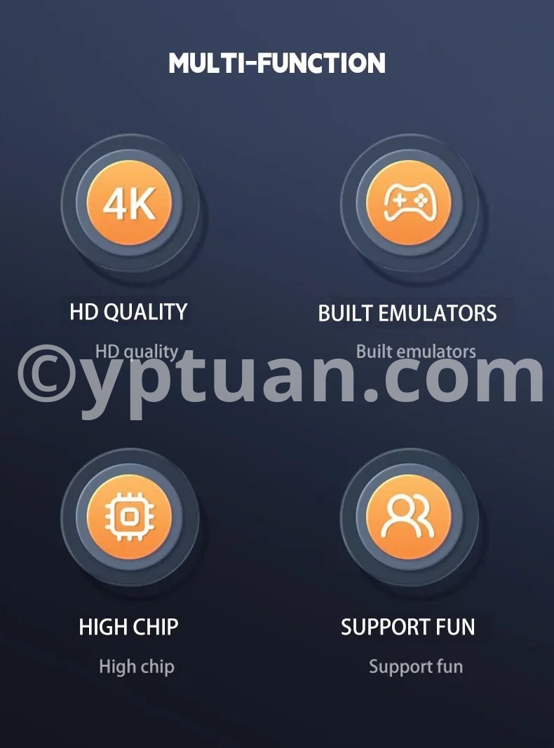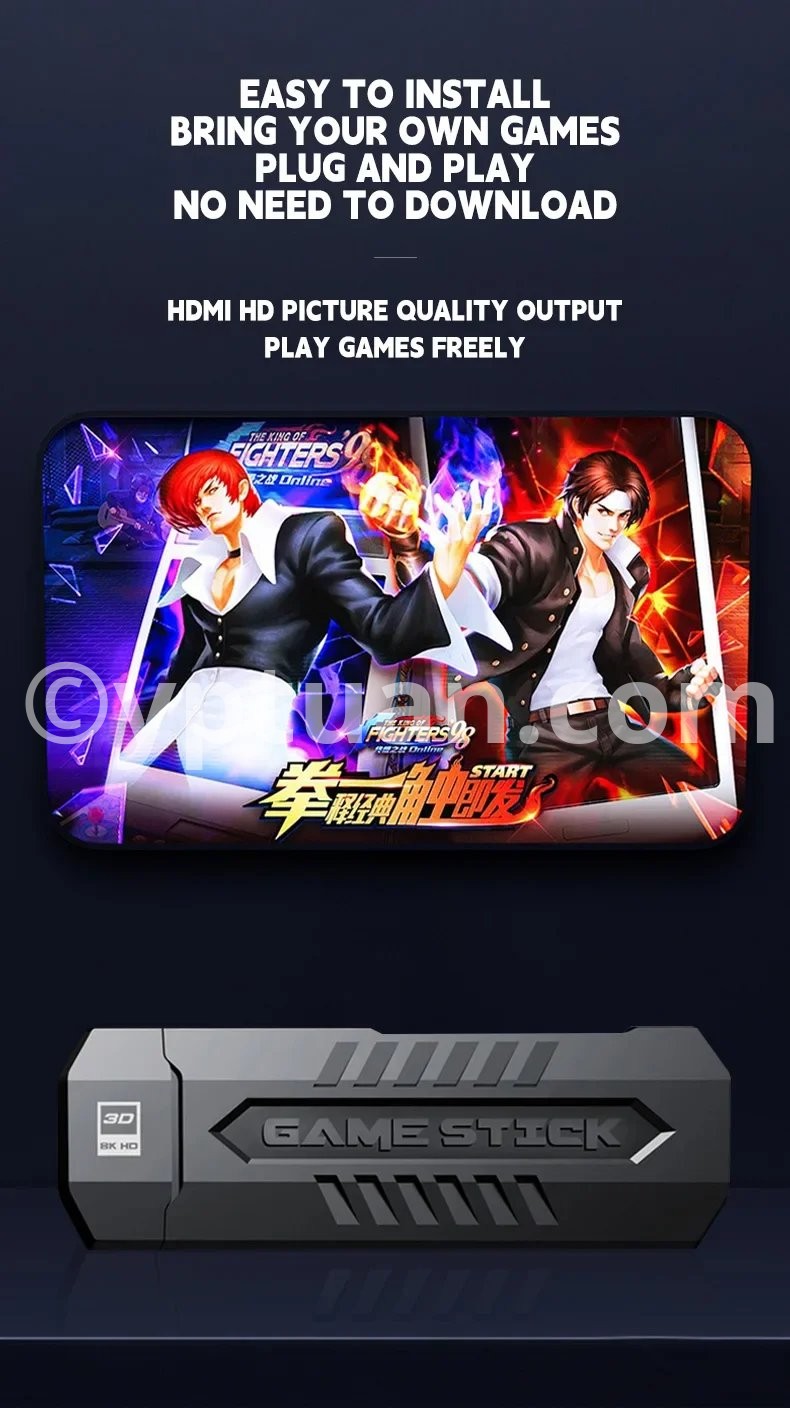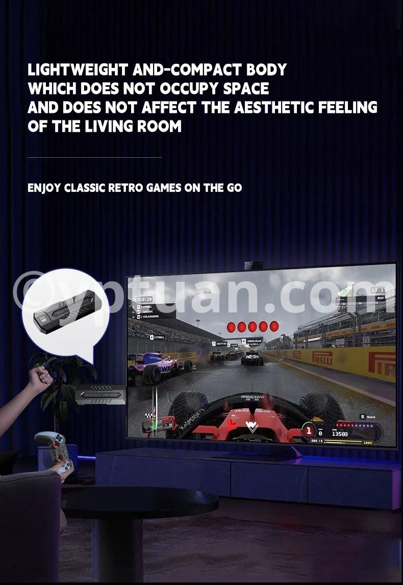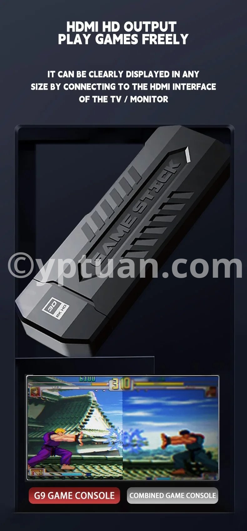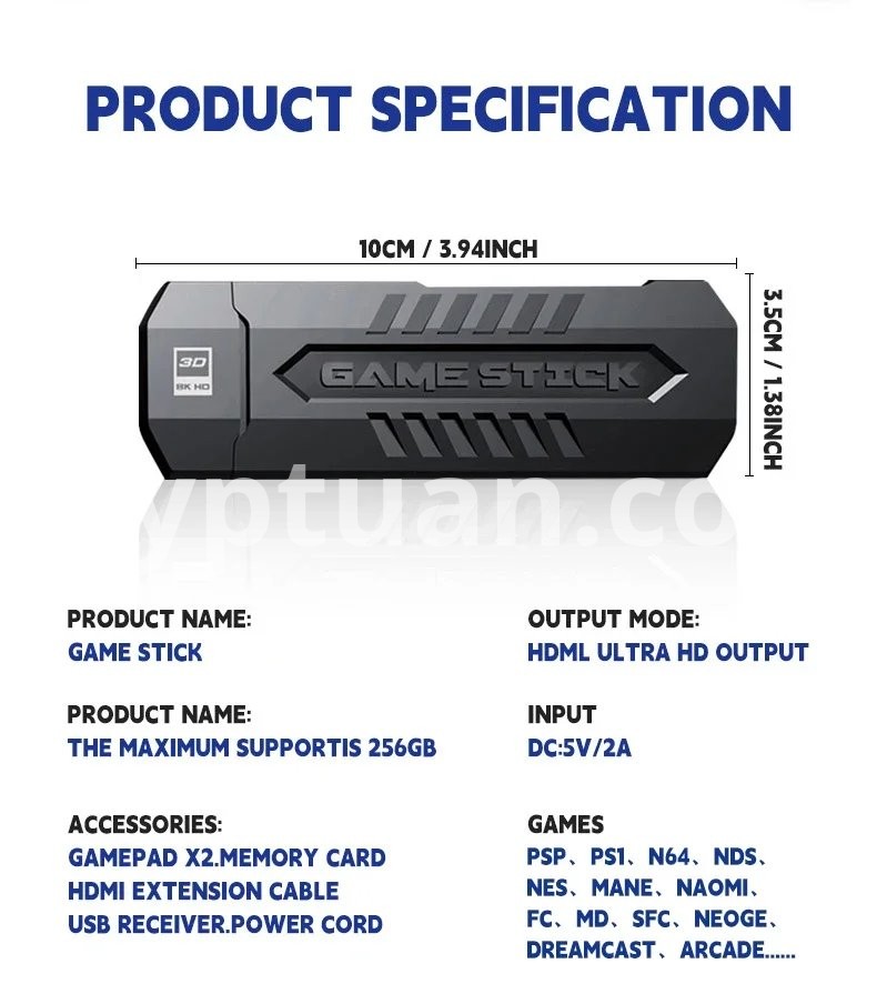 Specification for 4K Game Stick: * Name: Video Game Console * CPU: Aigame S905 * System: Emuelec4.3 * Support more large 3D Games. * Function: With search function, collection function, game progress saving function * HD output support HD 4K: Output 60FPS Max, HD 2.1D output 1280*720 resolutions * Wireless Controller: 2.4G Wireless Controller Support 1-2 Player, Get rid of the limitation of the cable and play freely * Support 30+ Simulators