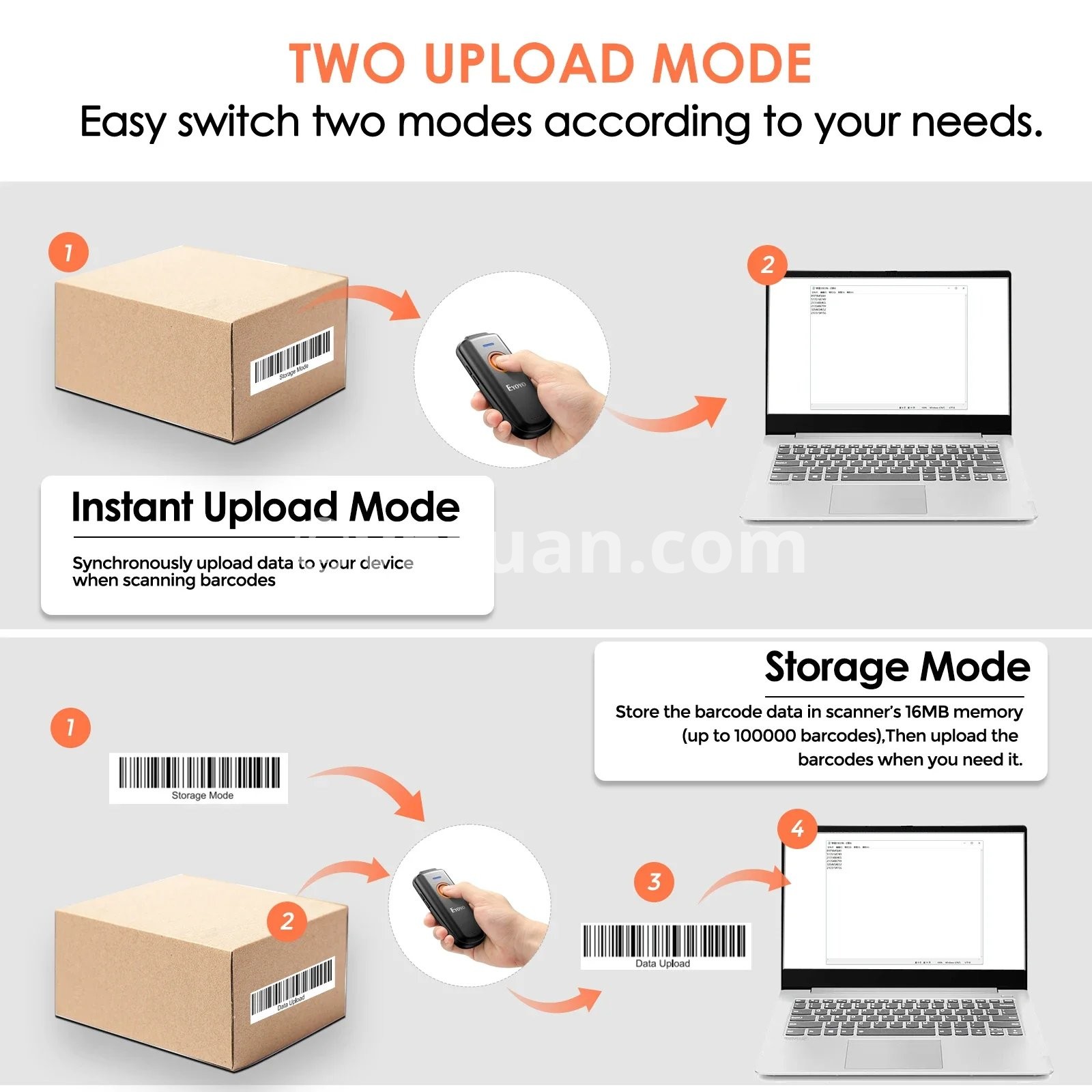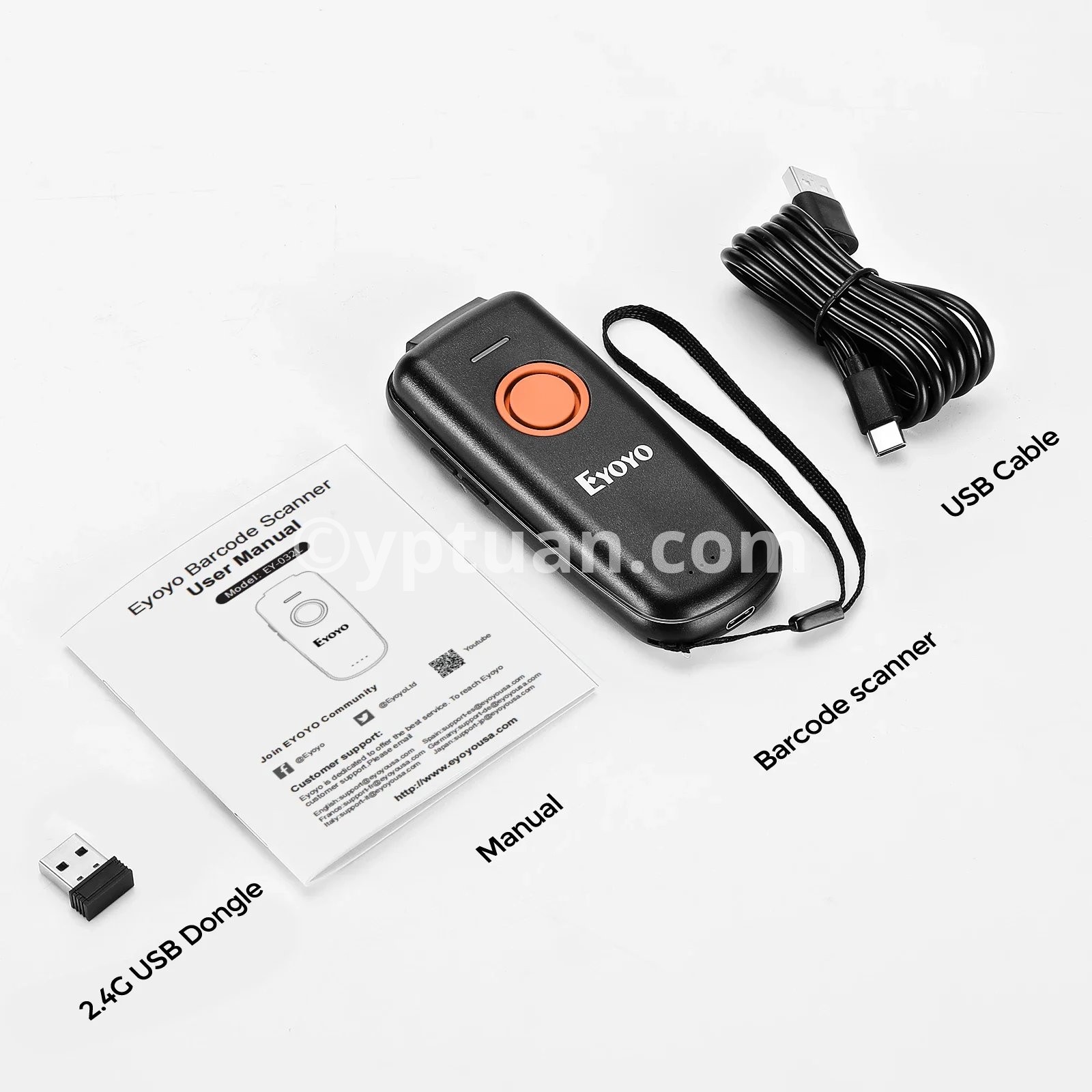 Description: Why Choose This Eyoyo Barcode Scanner? Upgrade 1: This eyoyo scanner add the volume up/down button, you can adjust volume by press the button directly.Never worry about losing the manual and can't adjust the volume. Upgrade 2:This bluetooth barcode scanner add the power on/off button, never worry about the battery drain up or or accidentally touching the barcode scanner in your pocket. Upgrade 3:The mini bluetooth barcode with 1500mAh high capacity rechargeable battery.The battery can scan continuously for more than 16 hours, you don't need to worry about the problem of insufficient battery anymore, so you can work all day without worry. Upgrade 4:The wireless barcode scanner with the power indicator, you can easily know how much power is available and whether it is time to charge the barcode scanner. Upgrade 5: The wireless scanner built in USB-C charging port, positive and negative can be inserted, do not worry about damage to the charging interface. Package Included: USB Receiver*1 Barcode Scanner*1 USB Cable*1 User Manual *1