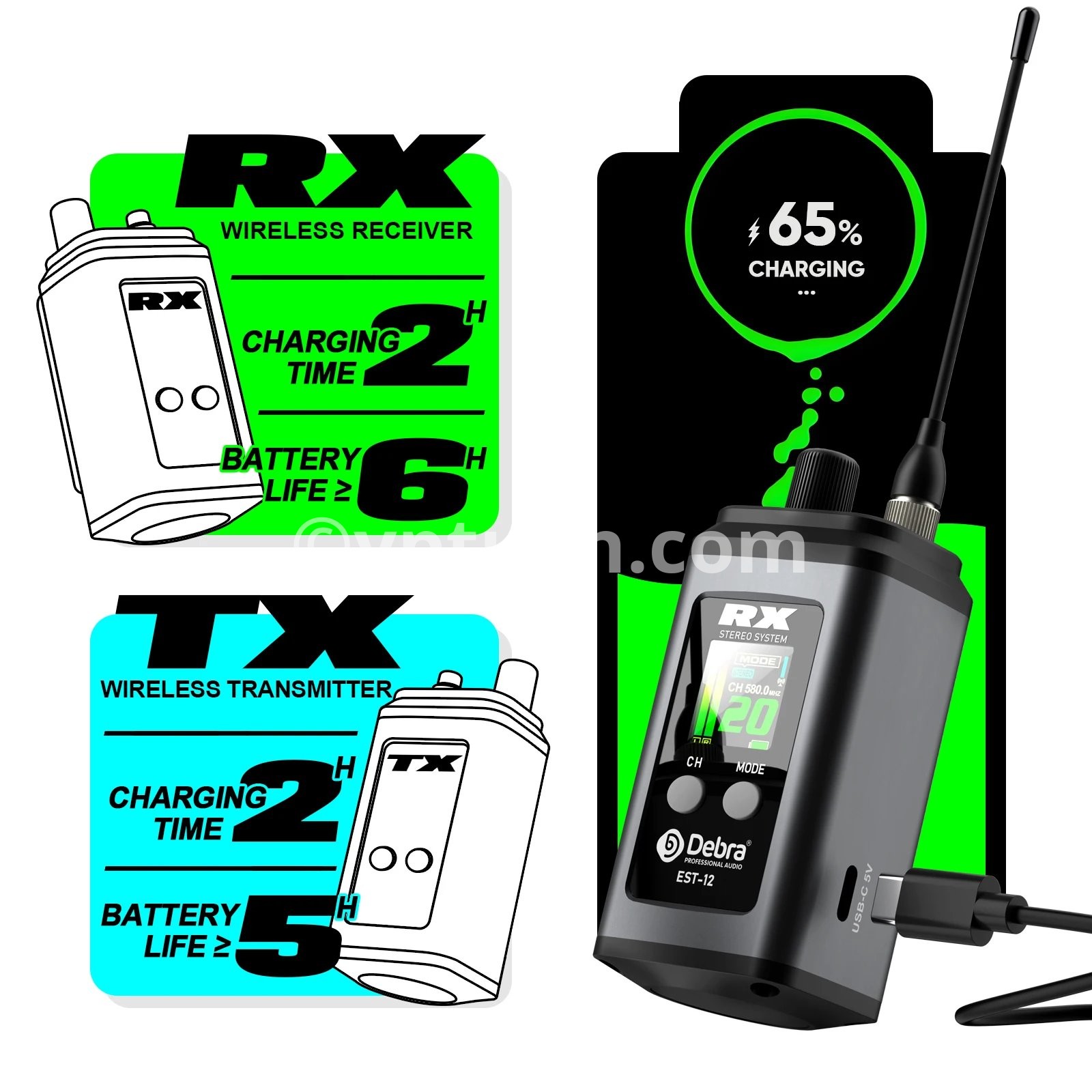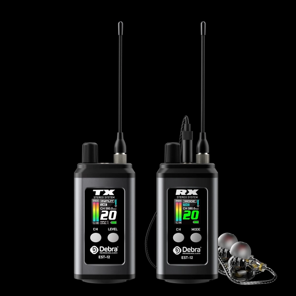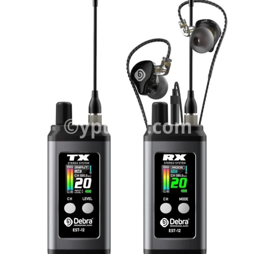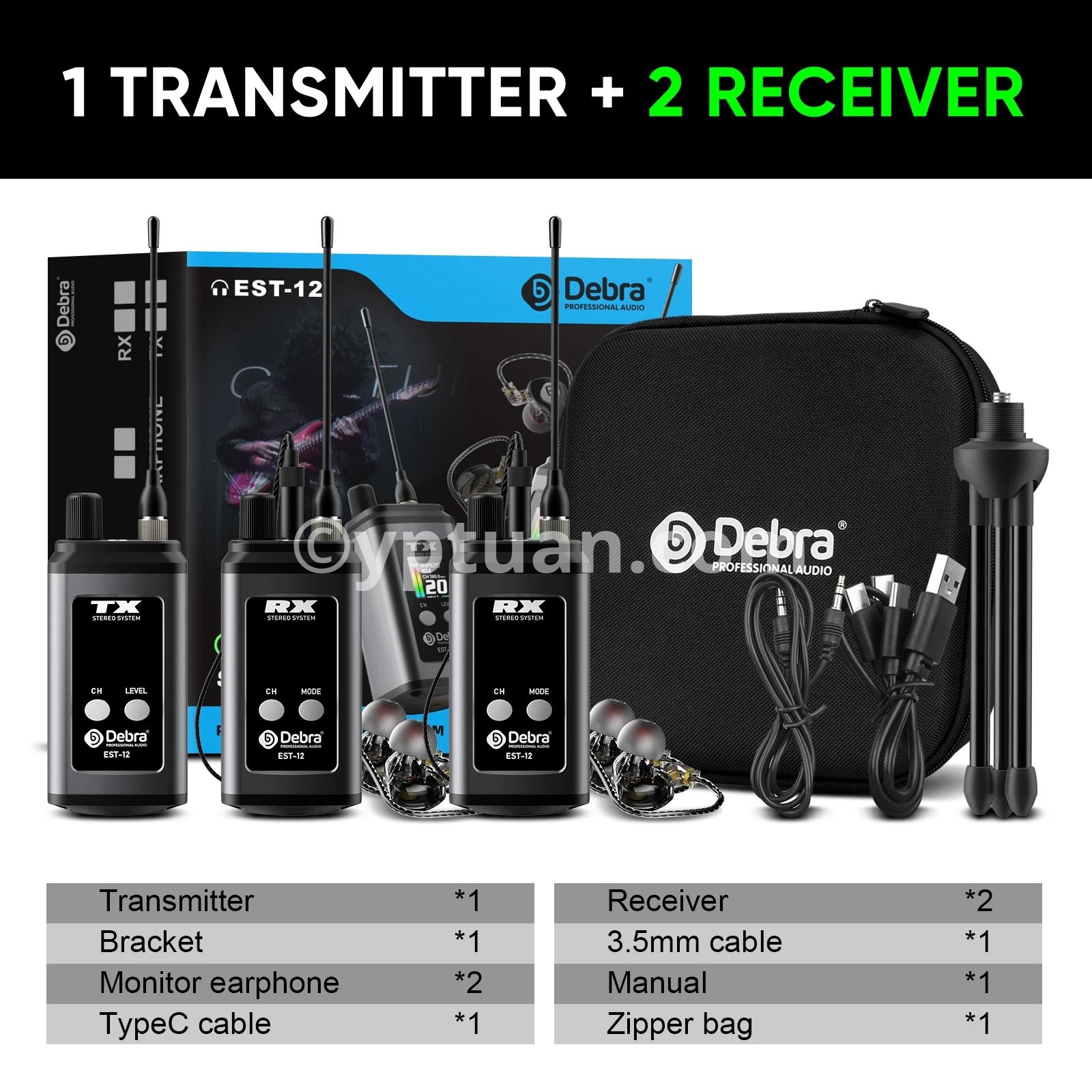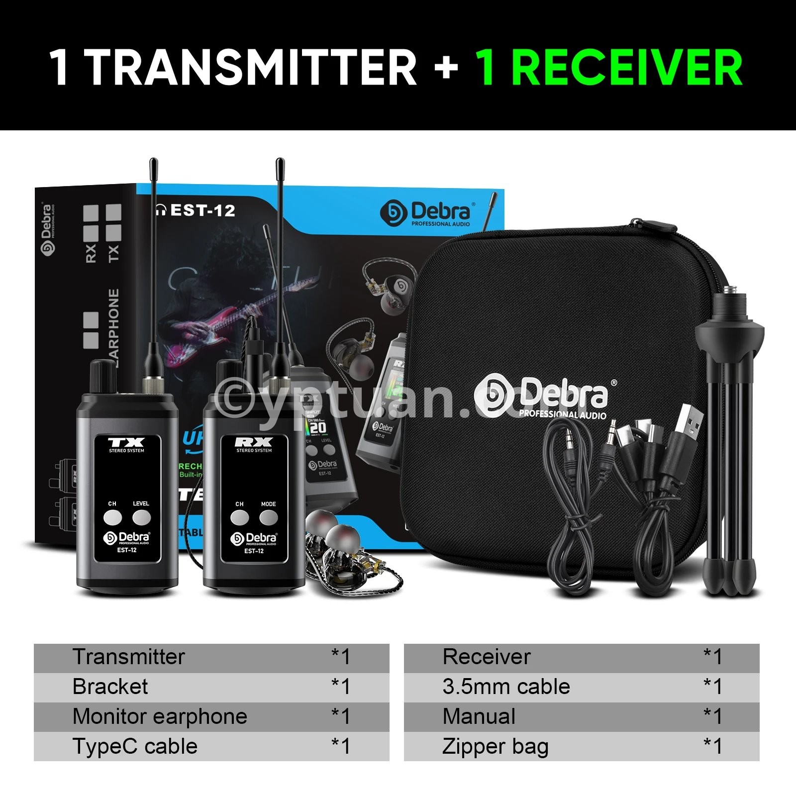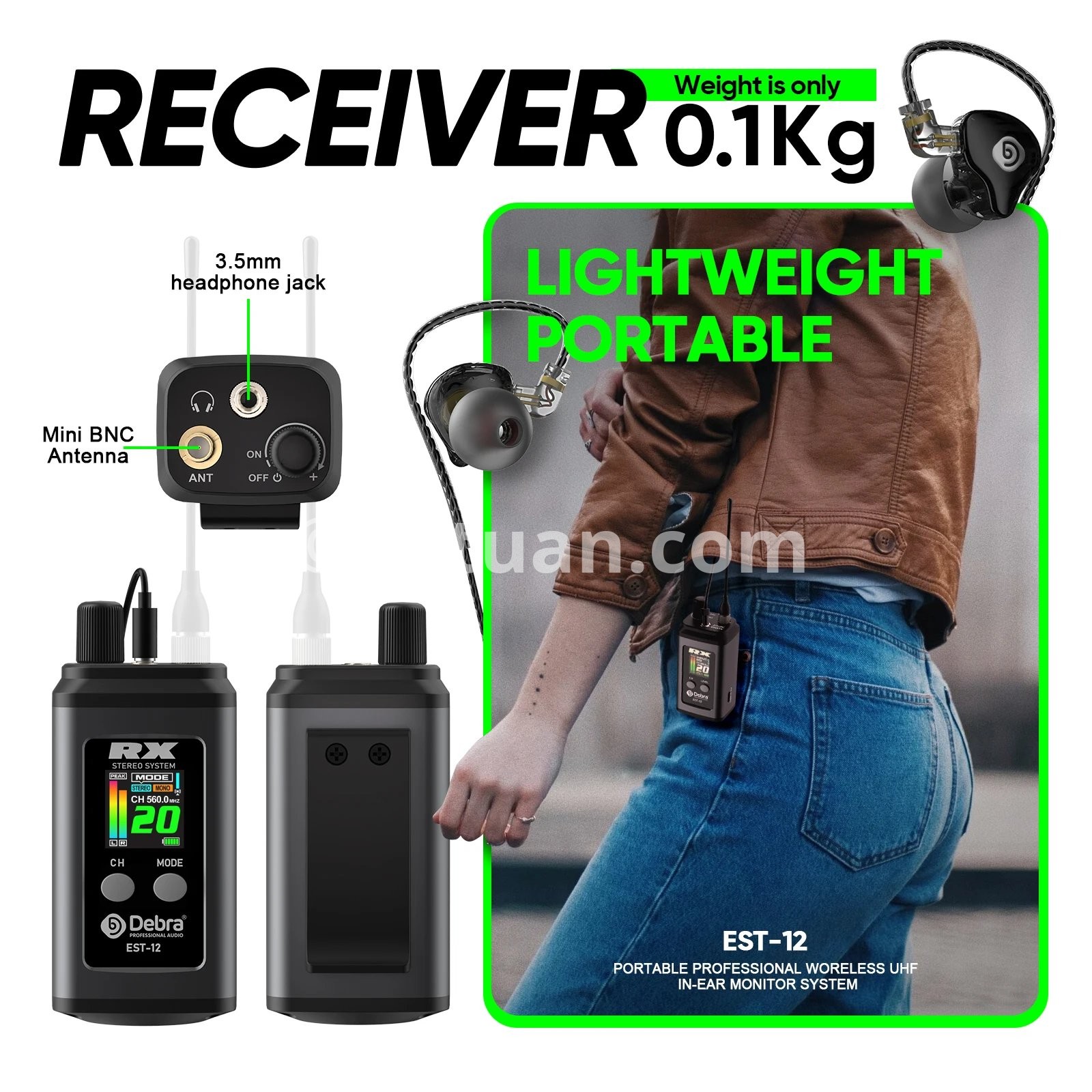 Debra EST-12 UHF Dual-Channel Wireless IEM System, 560-590MHz, 80m Range, Rechargeable In-Ear Monitor for Live Performance & Stu