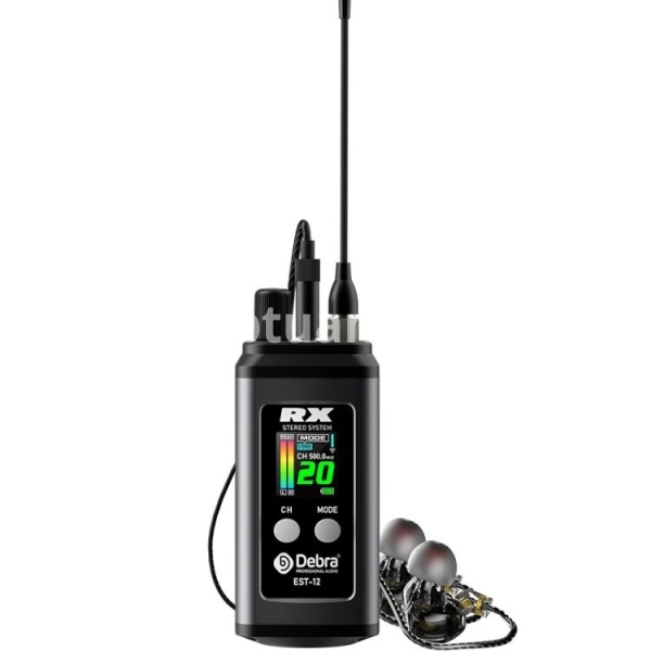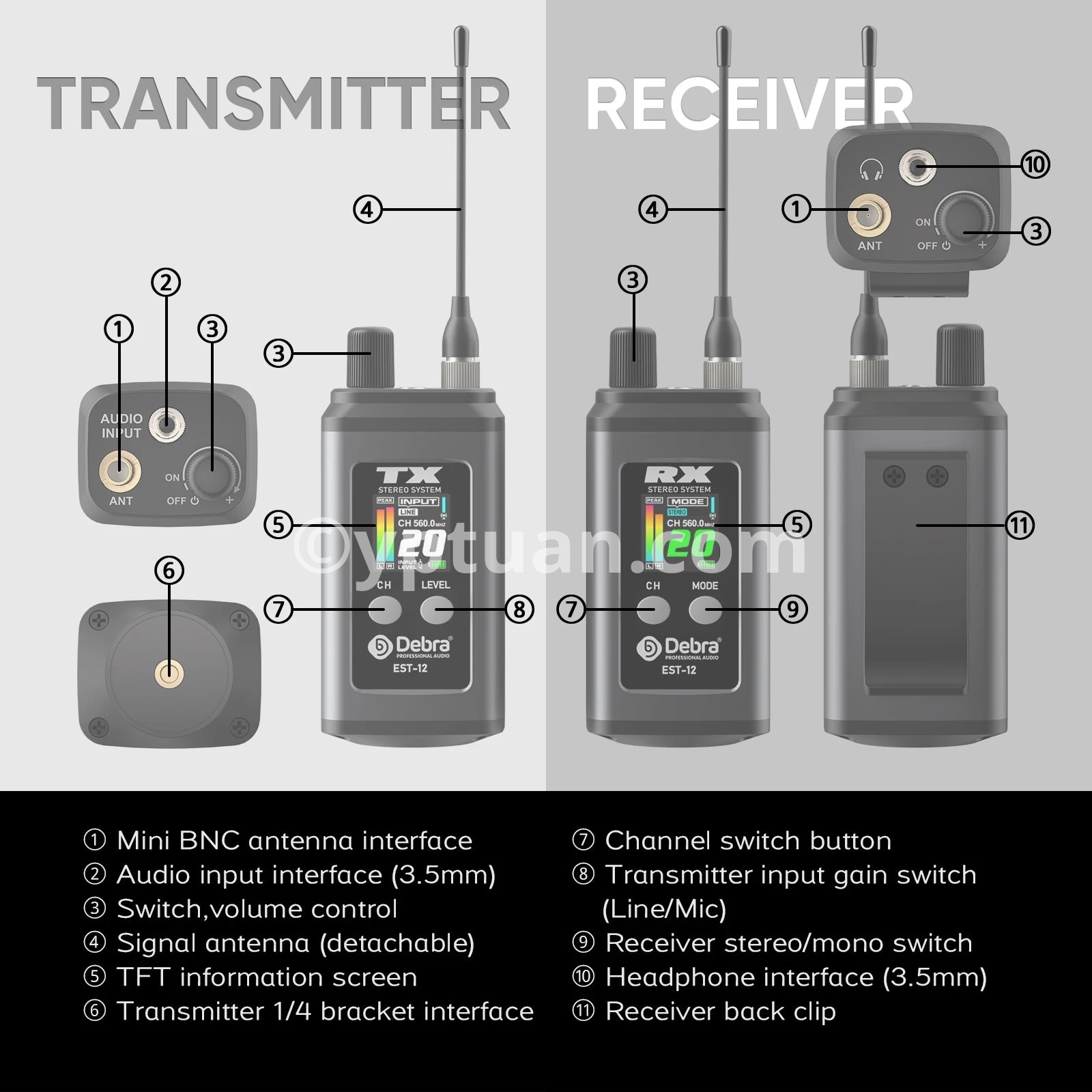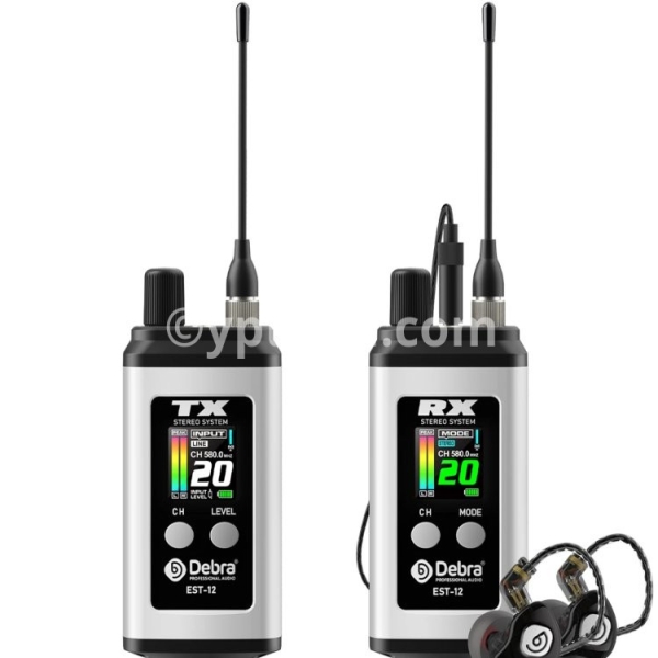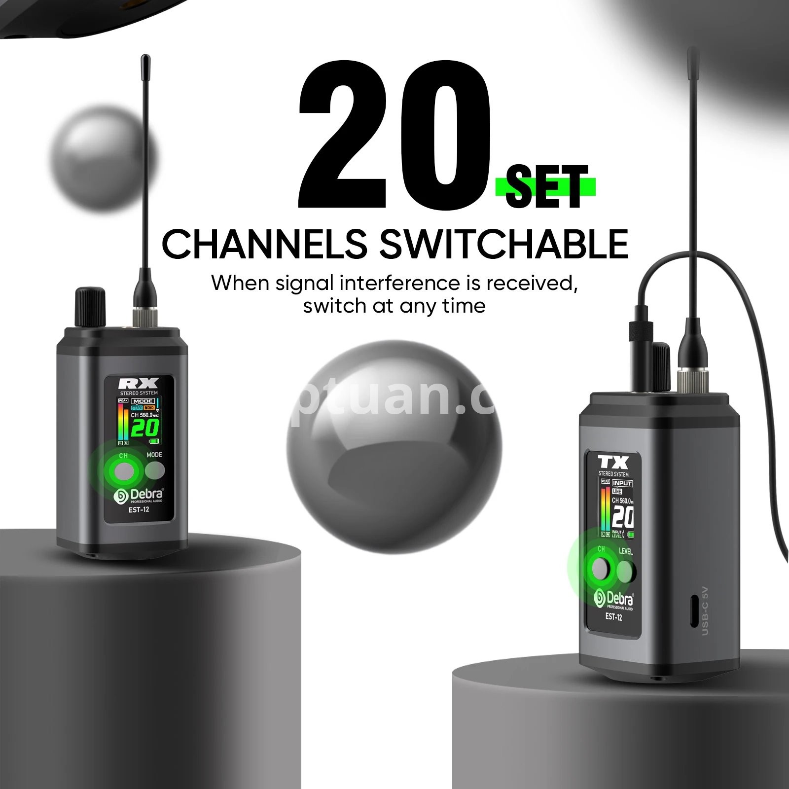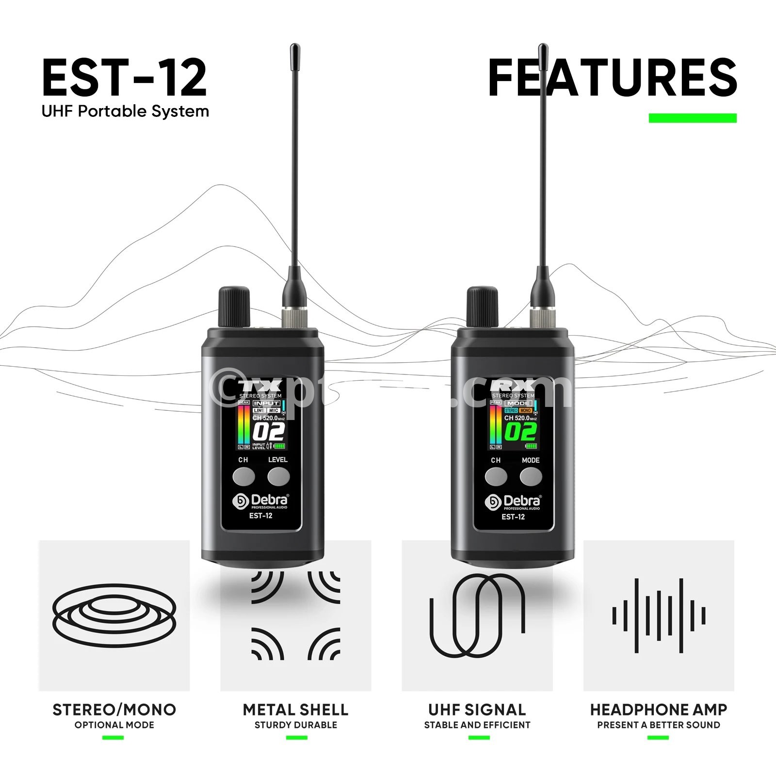 Debra EST-12 UHF Dual-Channel Wireless IEM System, 560-590MHz, 80m Range, Rechargeable In-Ear Monitor for Live Performance & Stu
