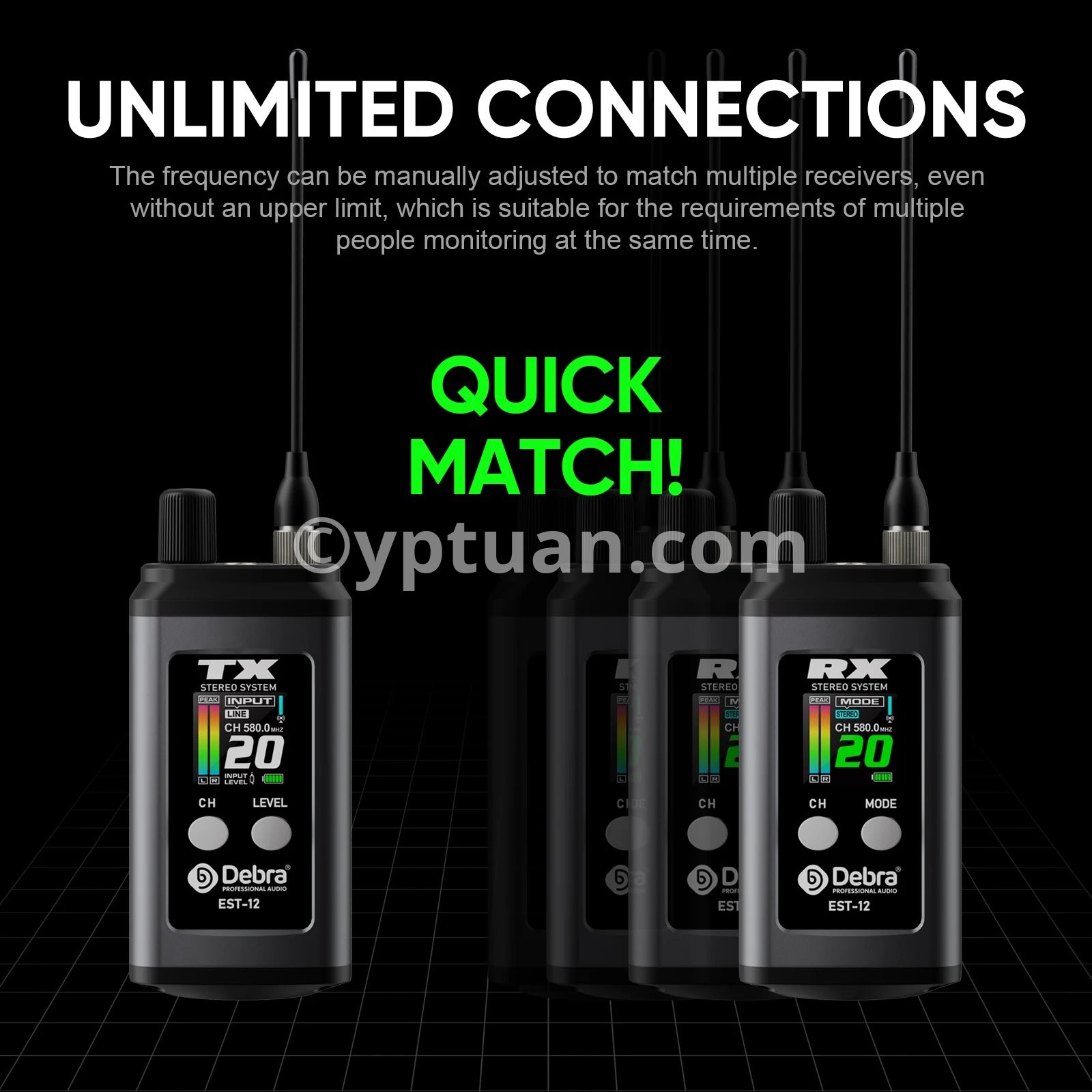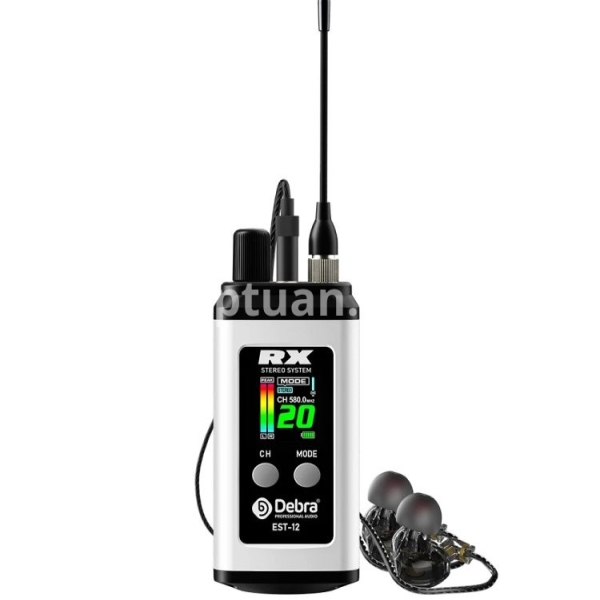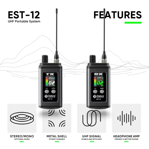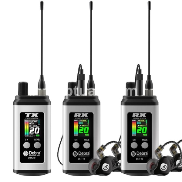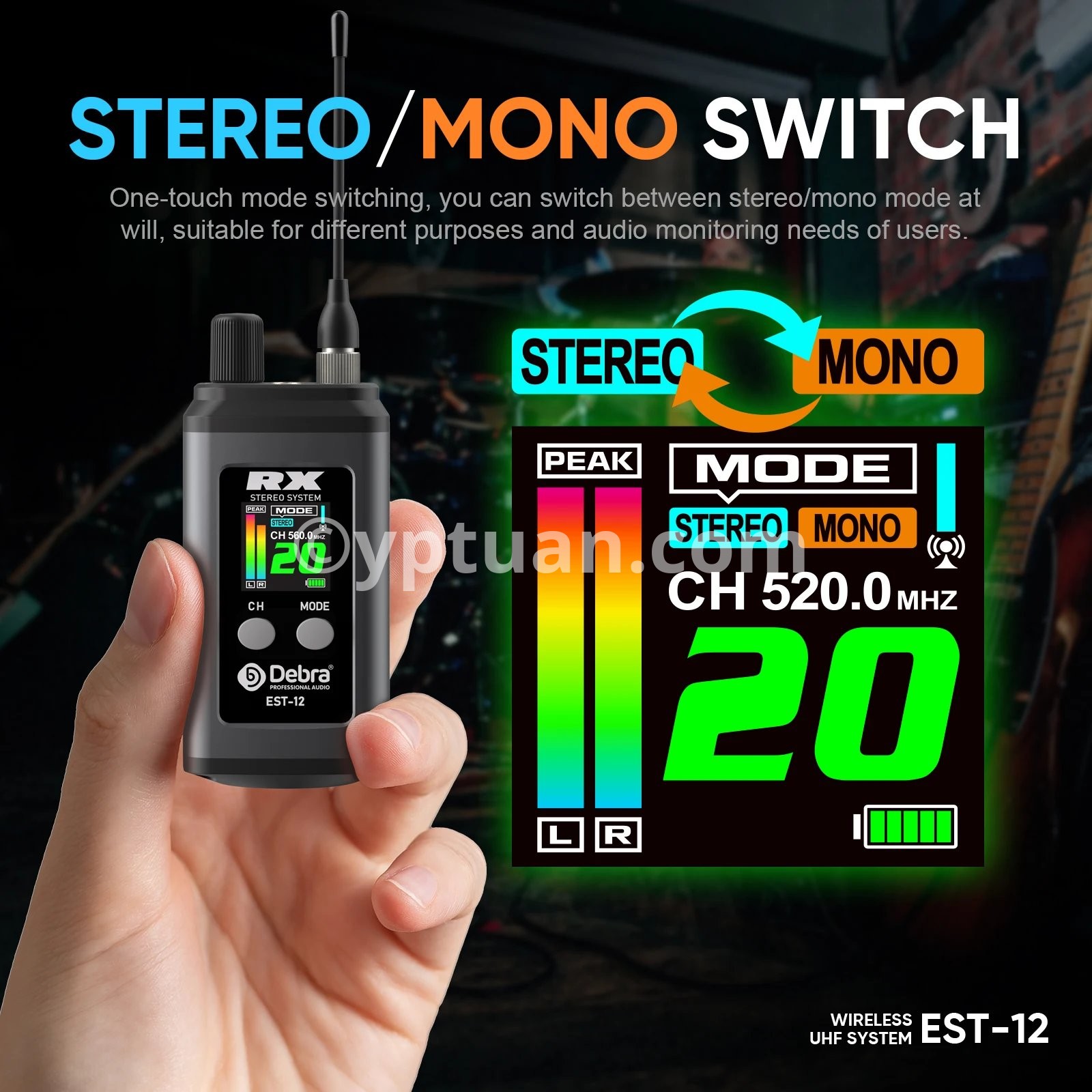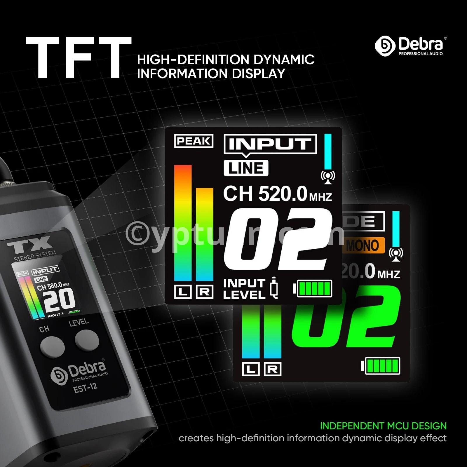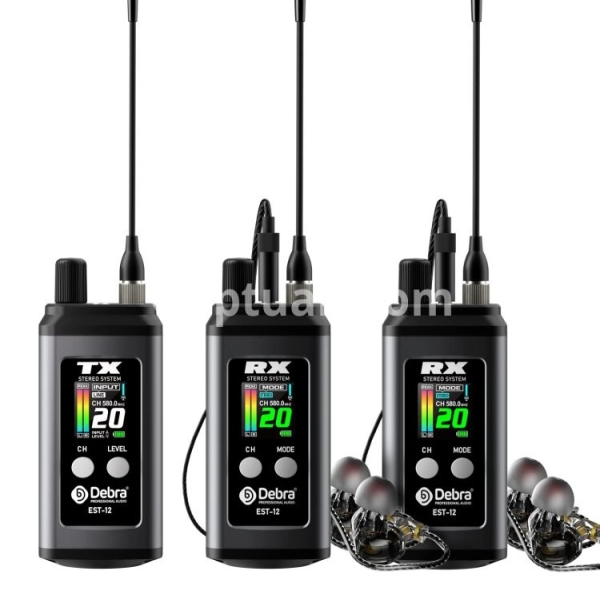 Debra EST-12 UHF Dual-Channel Wireless IEM System, 560-590MHz, 80m Range, Rechargeable In-Ear Monitor for Live Performance & Stu