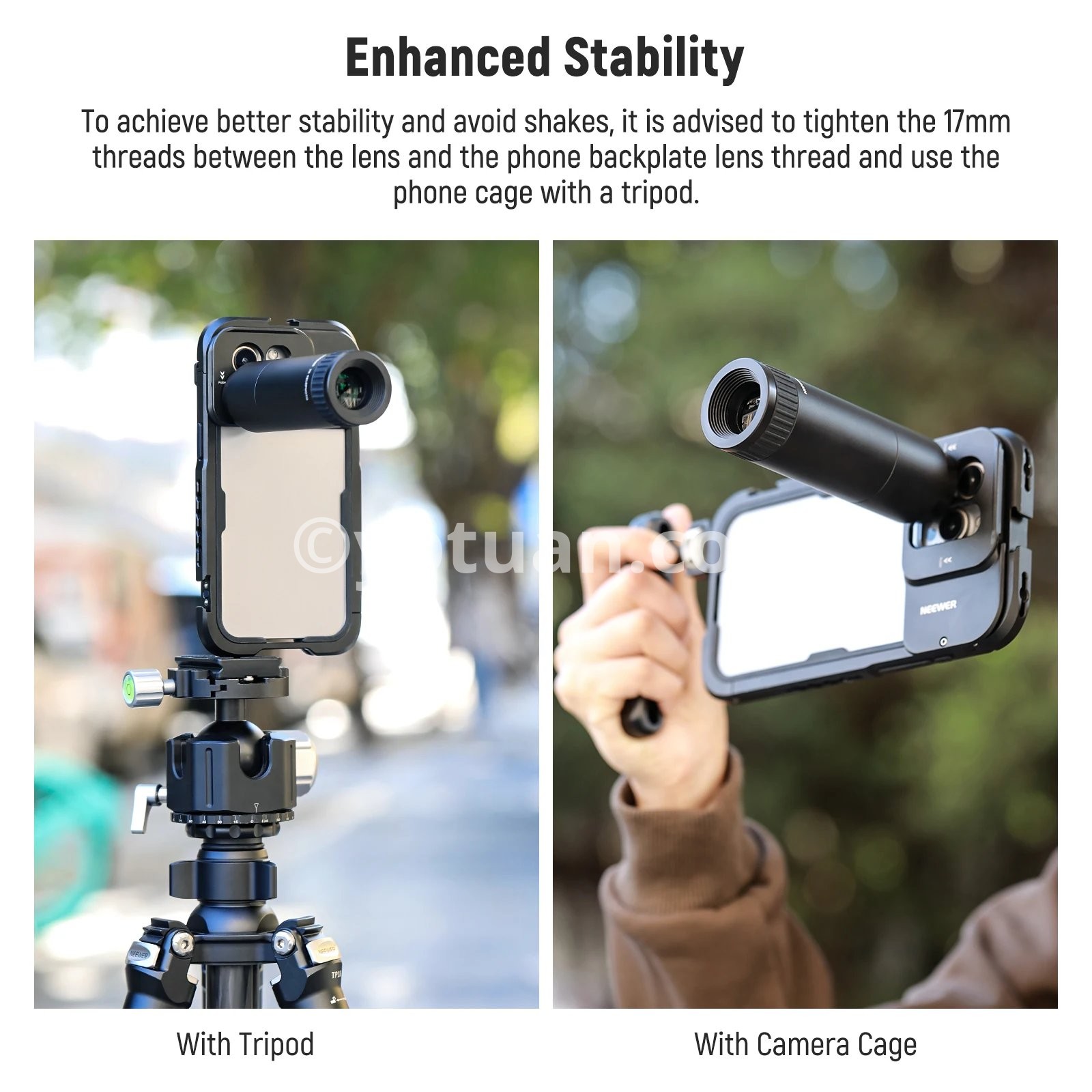 【Note】 To achieve better stability and avoid shakes, it is advised to tighten the 17mm threads between the lens and the phone backplate lens thread and use the phone cage with a tripod