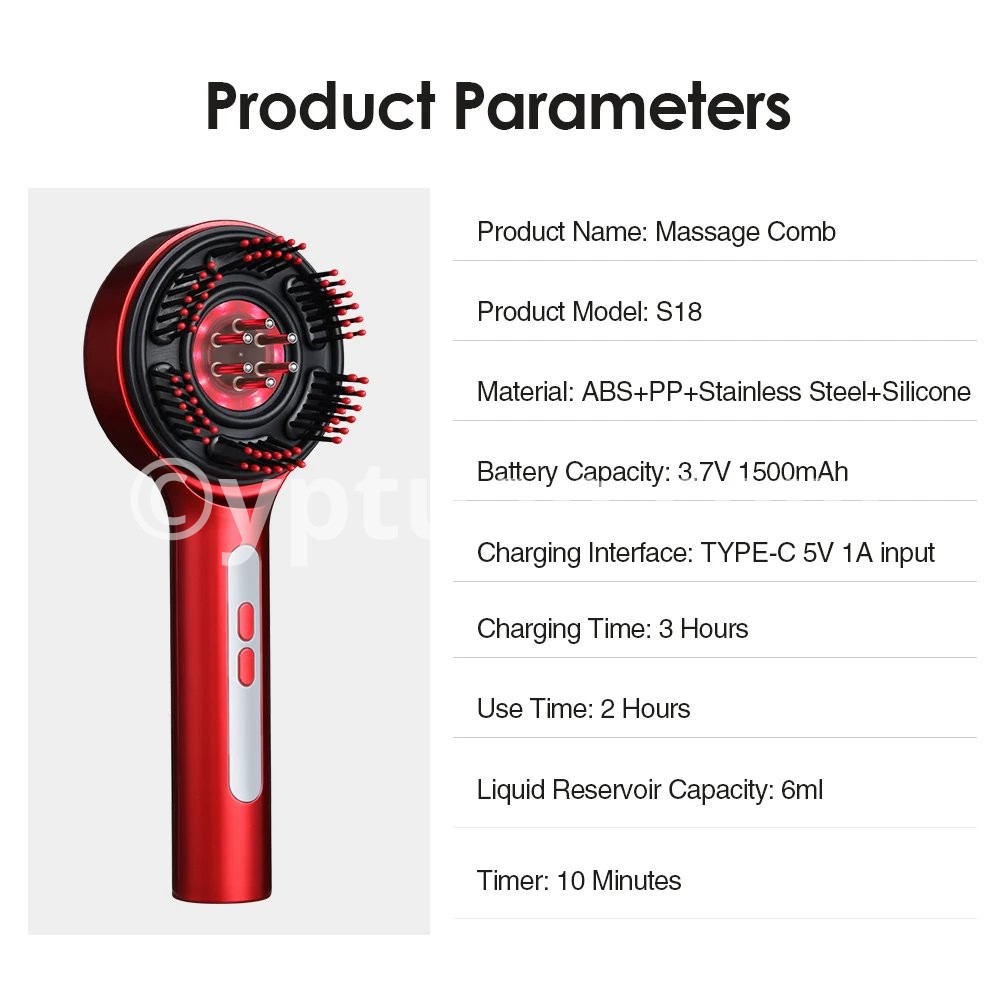 Product Name: Massage Comb Product Model: S18 Material: ABS+PP+Stainless Steel+Silicone Battery Capacity: 3.7V 1500mAh Charging Interface: TYPE-C 5V 1A input Charging Time: 3 Hours Use Time: 2 Hours Liquid Reservoir Capacity: 6ml Timer: 10 Minutes