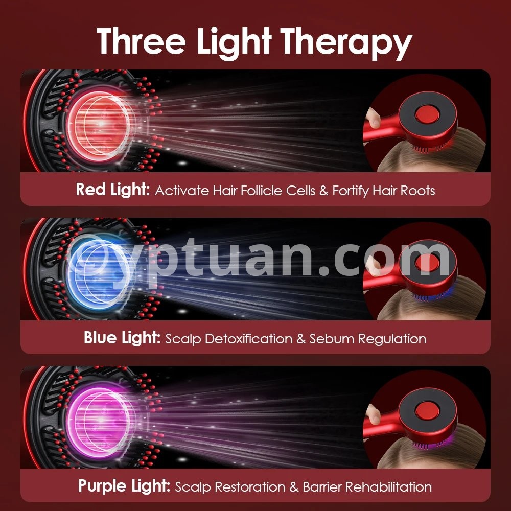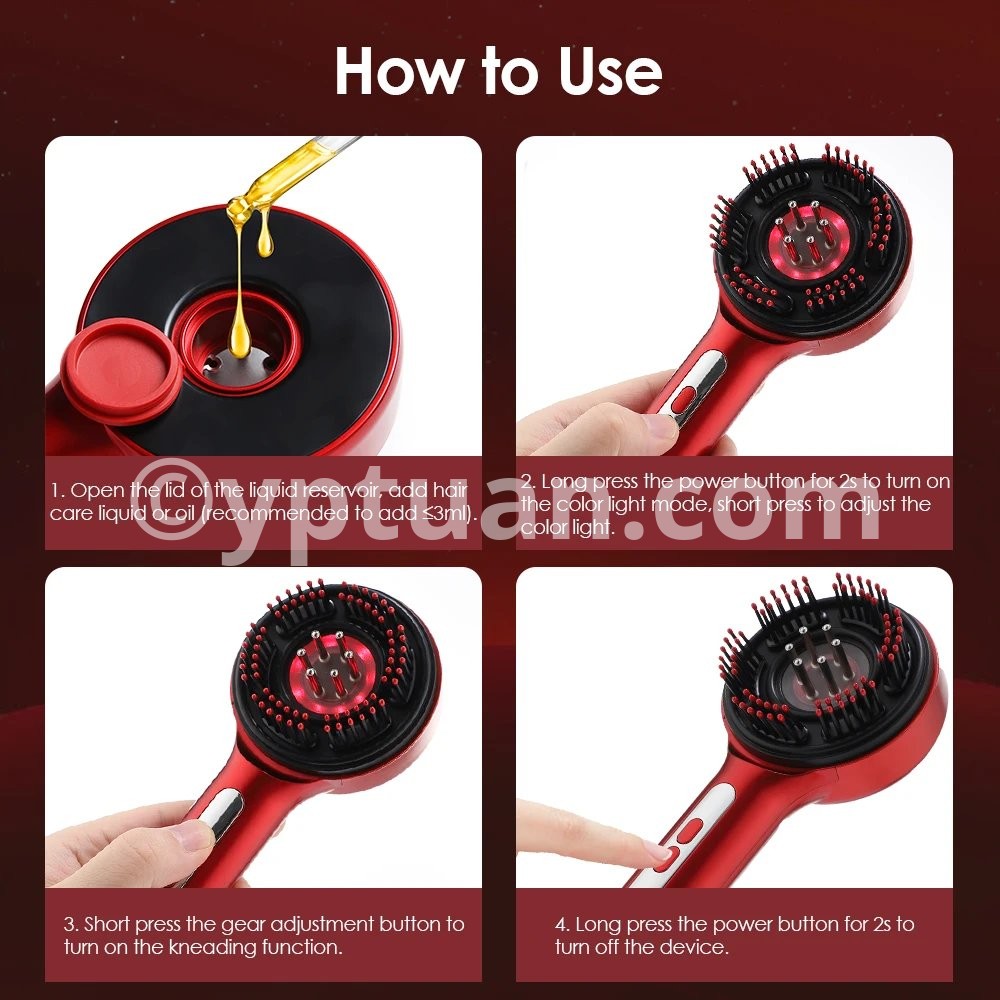 Note: Have NO Micro-current Function! Features: 1.This electric scalp massage comb features three light therapies: red, blue, and purple lights target specific scalp needs. 8 LED beads deliver light precisely to soothe scalp, revitalizing follicles and improving overall scalp health. 2. Equipped with an HD display screen, the scalp massaging brush displays real-time massage intensity and modes. Enable personalized adjustments through its intuitive controls. 3. Featuring a 6ml liquid reservoir, the hair comb ensures even distribution of essential oils through 6 conducting liquid roller balls. It deeply nourishes scalp, helps nutrient penetration, and improves nursing effect. 4. With 72 massage comb teeth, the hair oil applicator delivers a 360°grab and knead massage. Multiple pressure points stimulate blood circulation, relieving tension and reinvigorating the scalp. 5. The anti hair loss massager offers five intelligent adjustment levels, ranging from gentle soothing to deep tissue kneading. Mimicking professional massagist techniques, it caters to various comfort levels, ensuring an unparalleled massage experience.