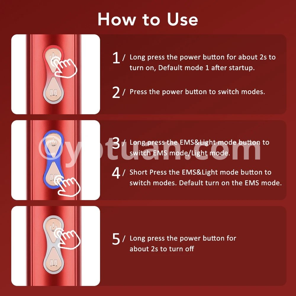 Material: ABS+PC+Silicone Color (spray paint): Red Input voltage: 5V 1A Working voltage: 3.7V 0.2A Power: 5W Battery type: lithium battery Battery model: 18500 Battery capacity: 1400mAh Charging time: about 3 hours Timing setting:10 minutes Machine size: 21.2*8.5*3.5cm Weight: 233g