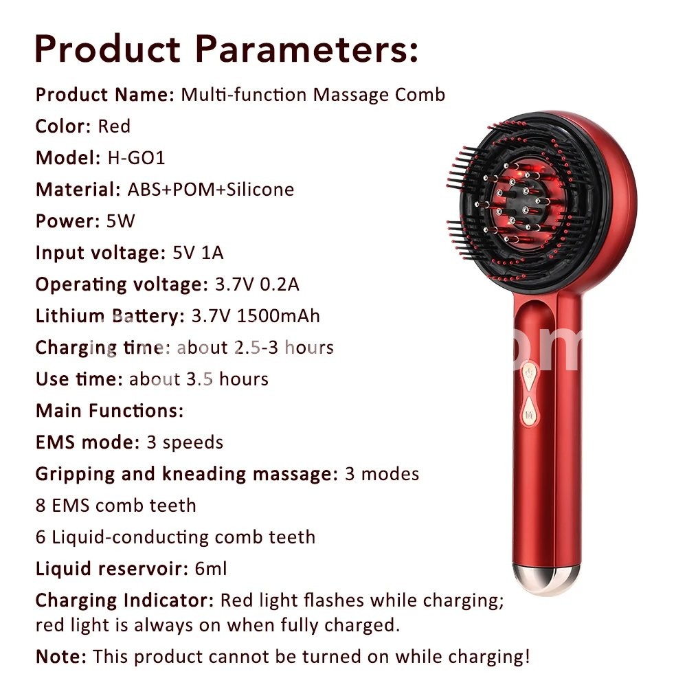 Product Name: Multi-function Massage Comb Color: Red Model: H-GO1 Material: ABS+POM+Silicone Power: 5W Input voltage: 5V 1A Operating voltage: 3.7V 0.2A Lithium Battery: 3.7V 1500mAh Charging time: about 2.5-3 hours Use time: about 3.5 hours Main Functions: EMS mode: 3 speeds Gripping and kneading massage: 3 modes 8 EMS comb teeth 6 Liquid-conducting comb teeth Liquid reservoir: 6ml Charging Indicator: Red light flashes while charging; red light is always on when fully charged. Note: This product cannot be turned on while charging!