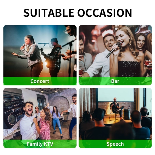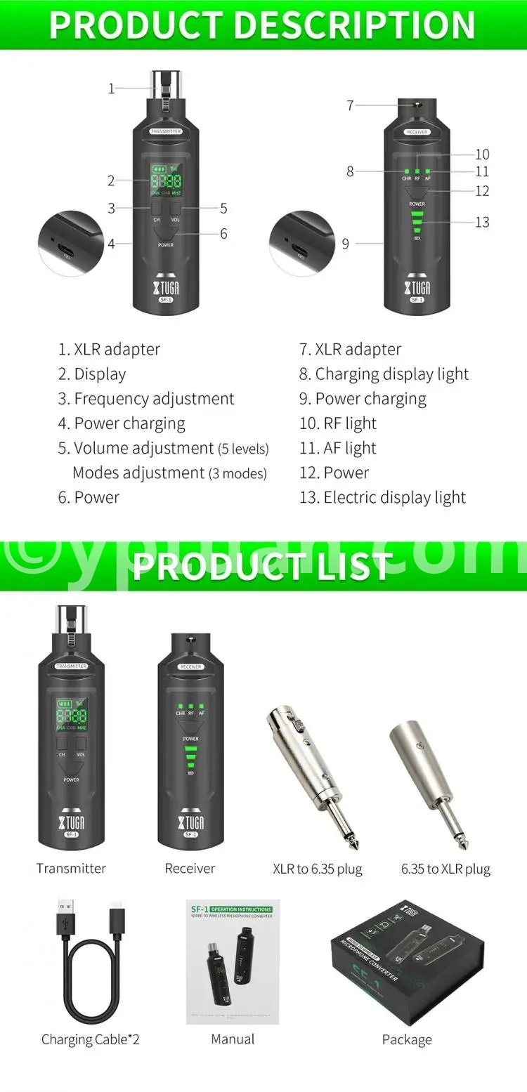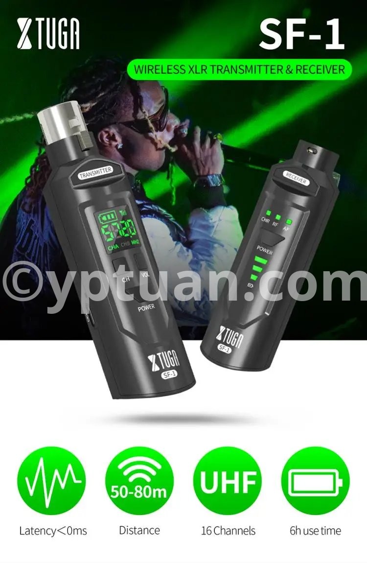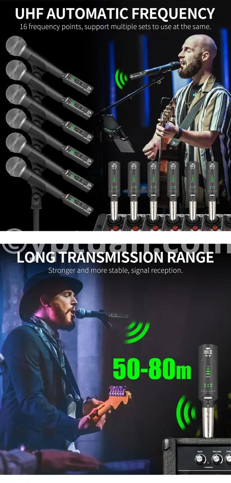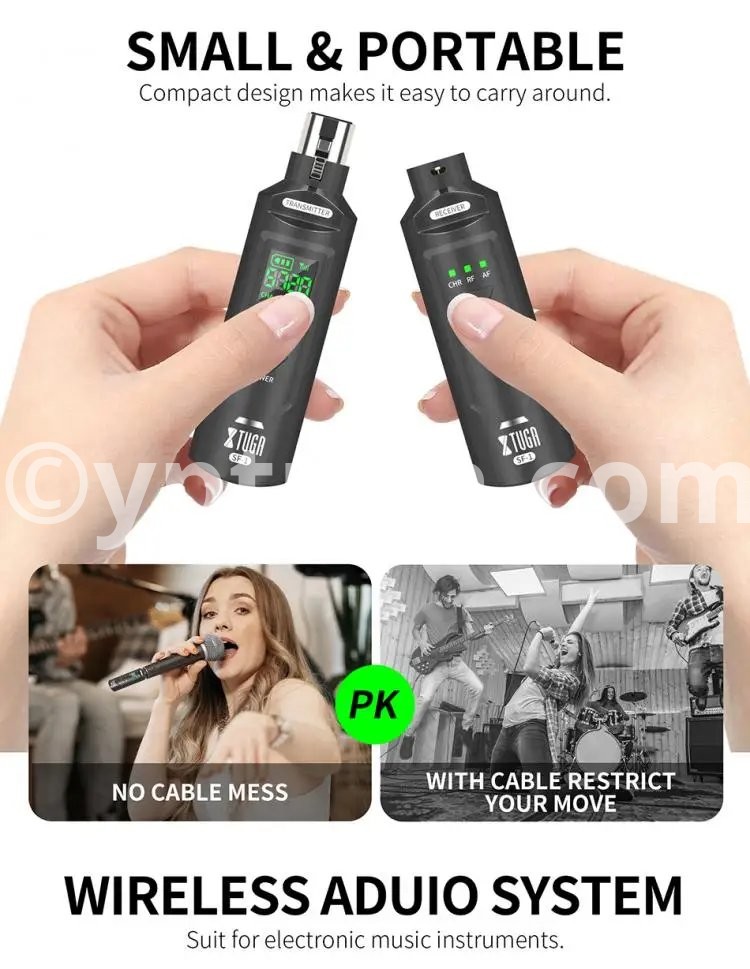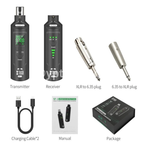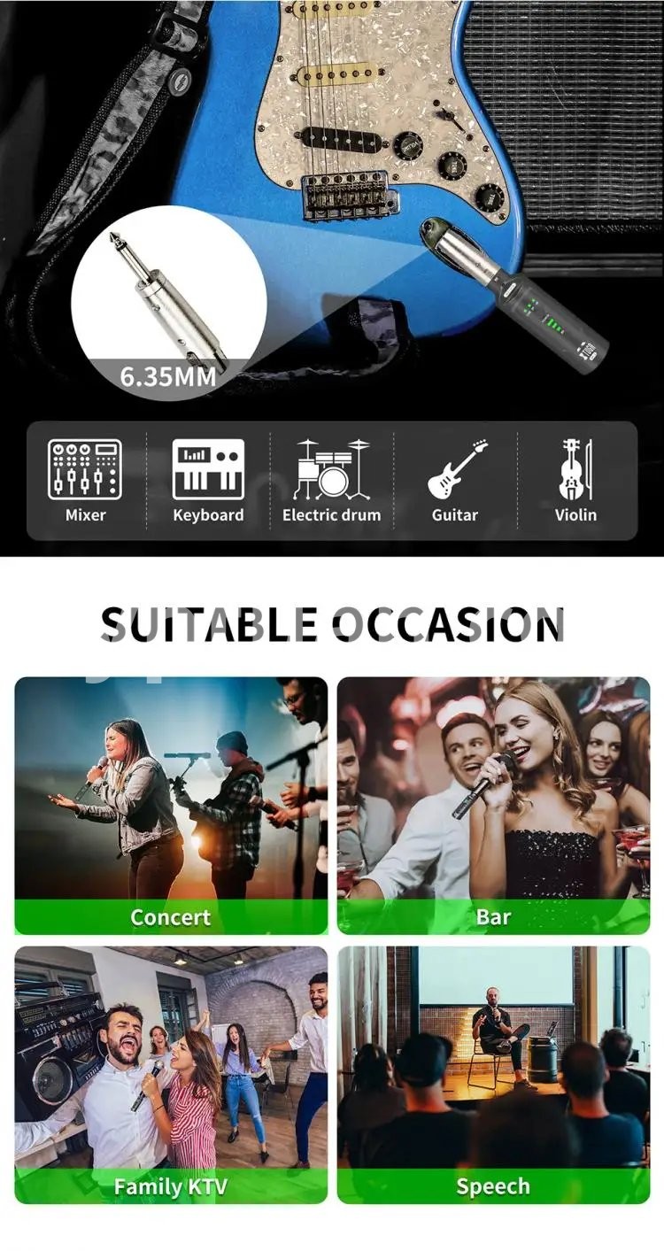 WIRELESS ADUIO SYSTEM: It is also suitable for electronic music instruments, such as, guitar, electronic drum, bass, violin and so on. Equipped with XLR female to 6.5mm male microphone adapter, compatible with mixers, recorders, speakers, sound reinforcement systems, power amplifiers, etc.