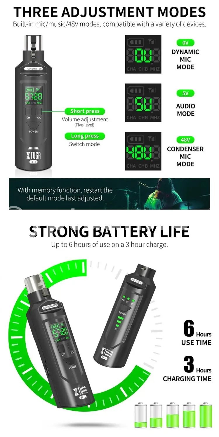 THREE ADJUSTMENT MODES: 0V, 5V, 48V voltage adjustment, compatible with dynamic microphone and condenser microphone, realize wireless singing: dynamic microphone is 0V, condenser microphone or recording microphone is 5V, phantom condenser microphone is 48V.