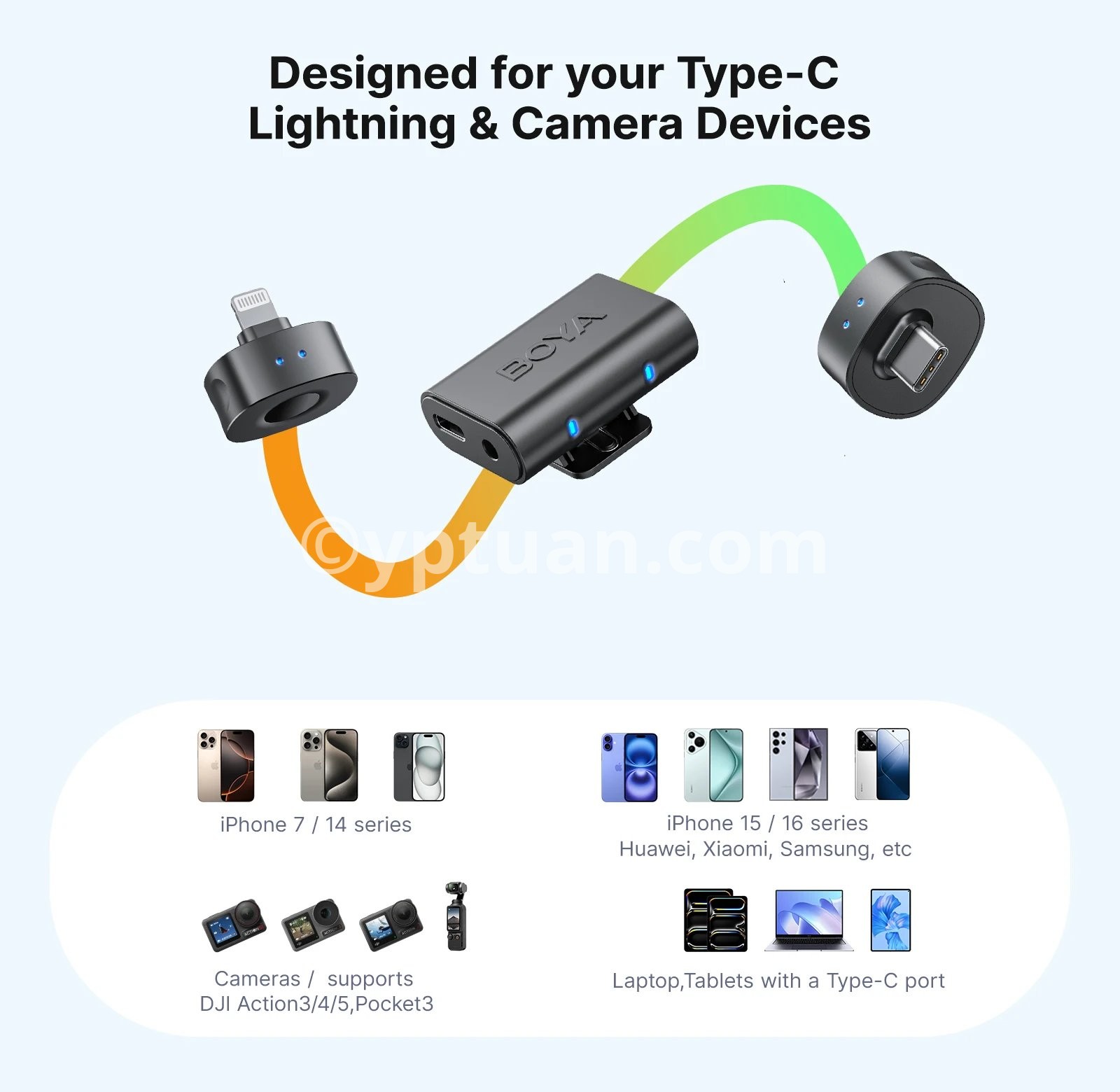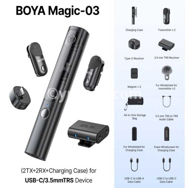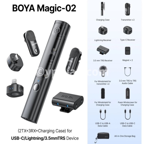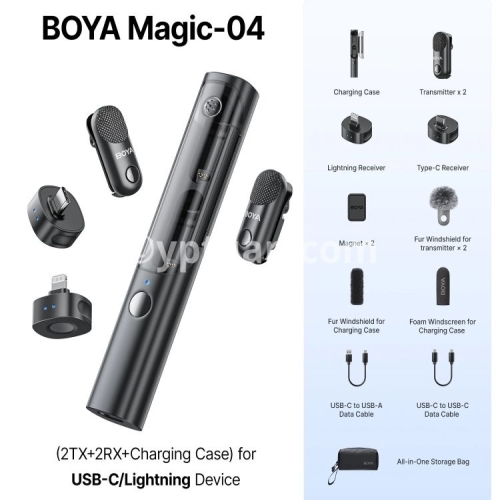 BOYA Magic series includes three types of receivers-USB-C, Lightning,and 3.5 mm TRS. lt is highly compatible with smartphones, tablets,computers, and cameras.The receiver features a USB-C charging port thatsupports simultaneous recording and charging of the mobile device. Eachtransmitter provides up to 6 hours of continuous use, and the chargingcase extends the total battery life up to 30 hours. lt also allows you torecharge the transmitter anywhere, making the BOYA Magic highlyportable and convenient for on-the-go use.