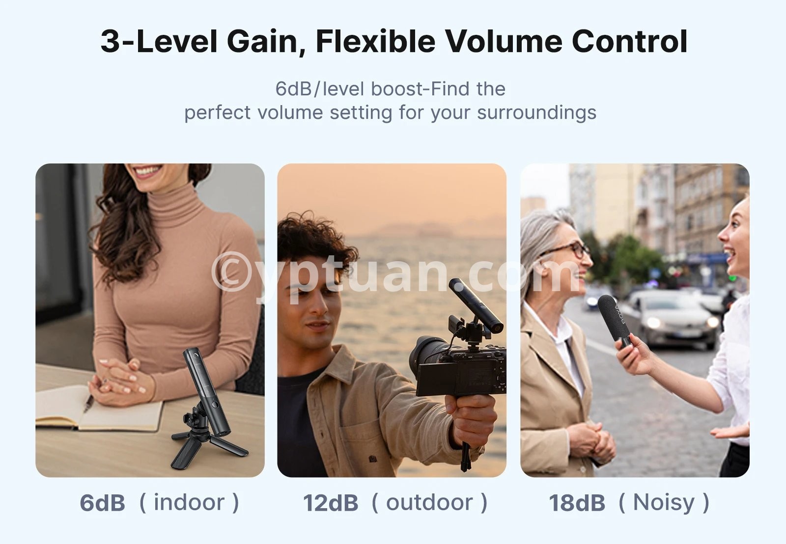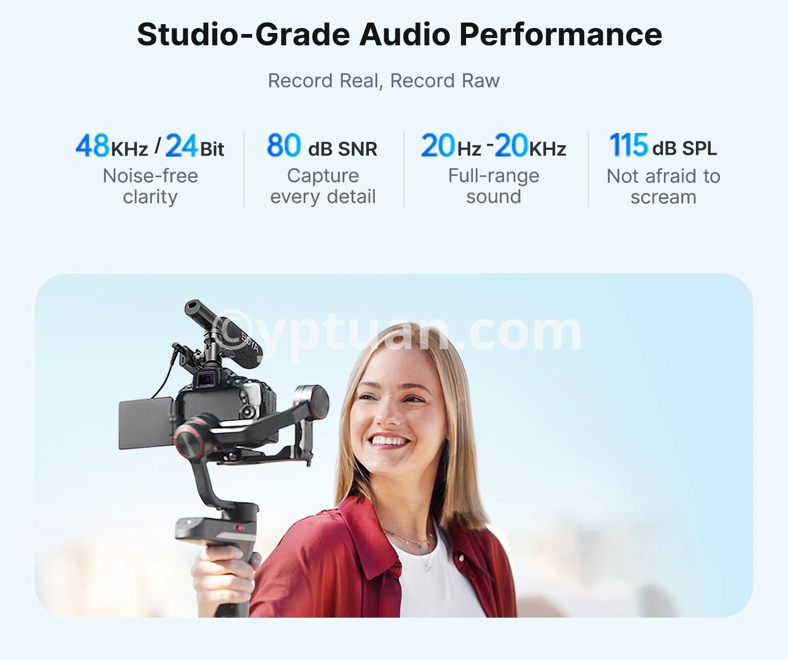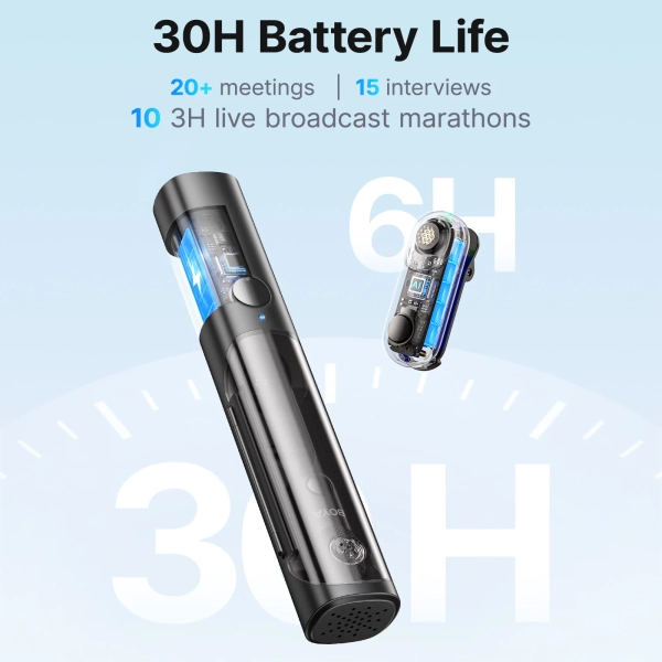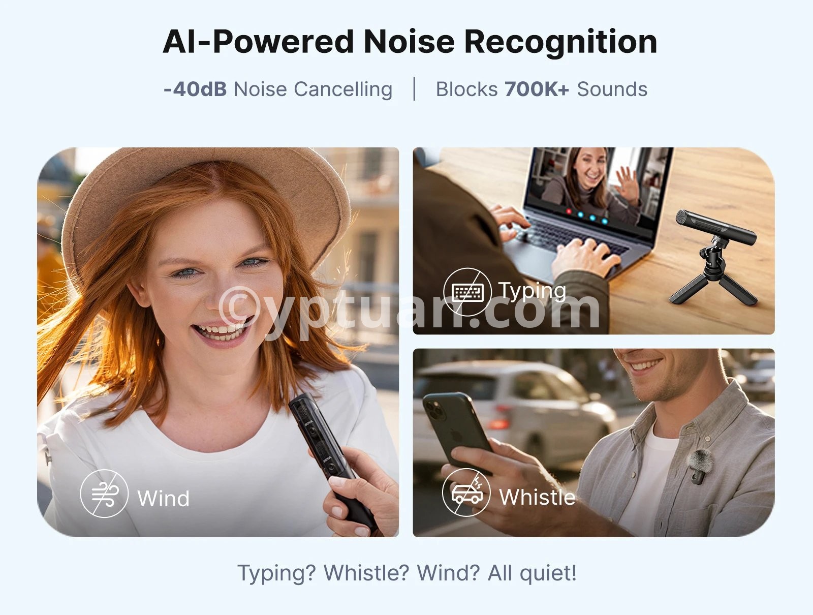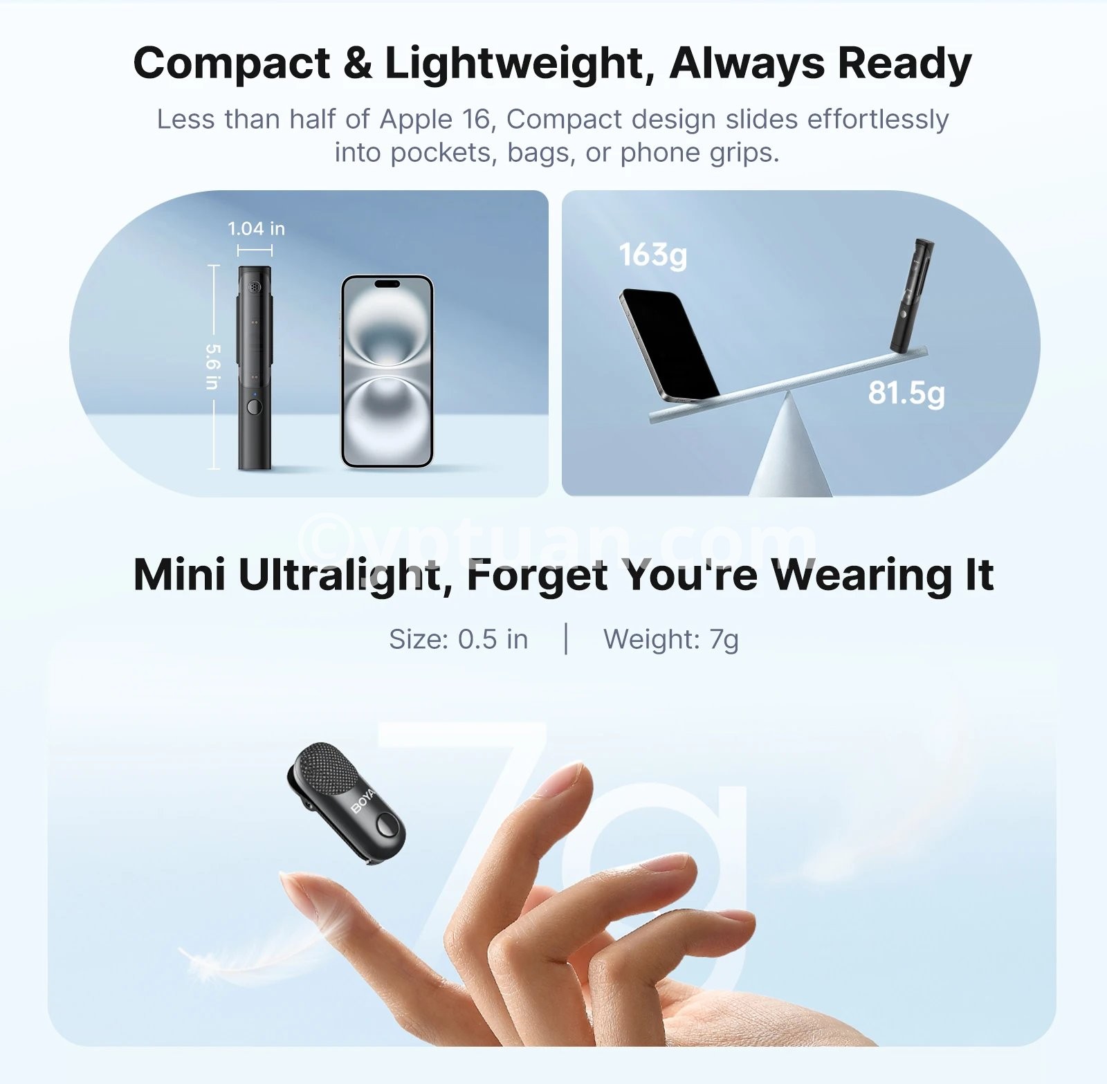 4 forms in 1: clip-on, handheld, desktop, or on-camera. True Al noise cancellation suppresses up to 40 dB. Only7g and 13 mm thin for discreet wear· 48 kHz/24-bit, 20 Hz-20 kHz pristine audio. Limiter and safety track prevent clipping. 6 hrs of battery life per mic, 30 hrs in total