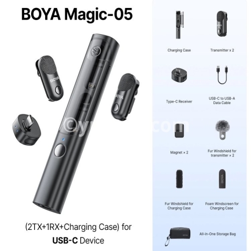 BOYA Magic is a transformable 2.4 GHz wireless microphone system,designed for flexible use across multiple scenarios.The lightweight andcompact transmitter ensures portability, while the charging case not onlystores the transmitters and receiver but also functions as a handheldmicrophone. When used with the BOYA desktop stand (sold separately), itcan also serve as a desktop microphone. With its ease ofoperation, theBOYA Magic is ideal for content creation, live streaming, vlogging, mobilejournalism,and much more.