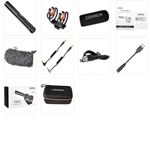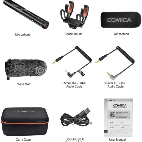 Microphone*1 Shock Mount*1 Windscreen*1 Wind Muff*1 3.5mm TRS-TRS Audio Cable*1 3.5mm TRS-TRRS Audio Cable*1 Charging Cable*1 Carry Case*1 User Manual*1 Warranty Card*1