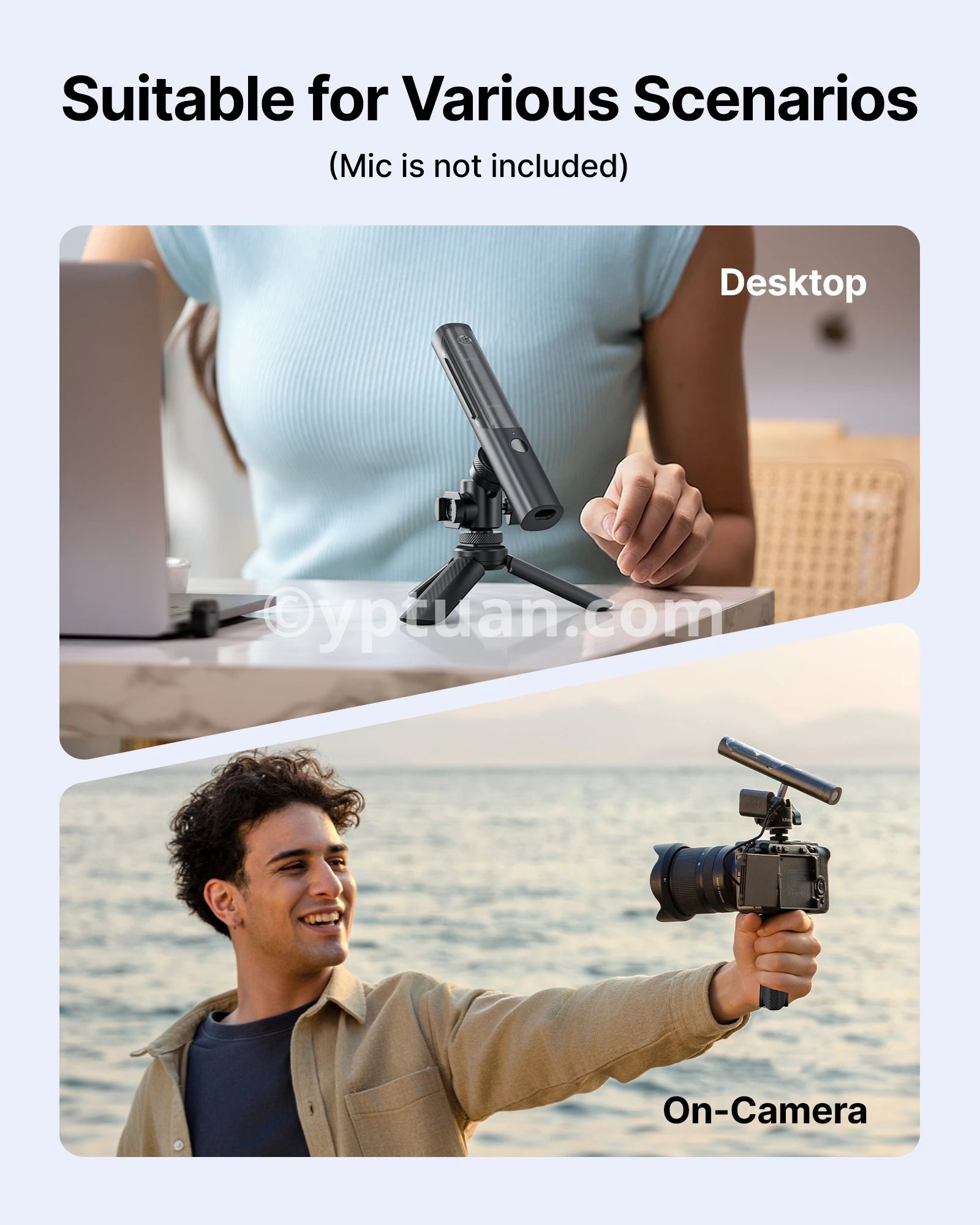 1.Stable Microphone Stand: The sturdy microphone stand holds strong on any surface. Its thick, durable legs prevent tipping or wobbling, giving you full confidence while recording. Focus on your work — no need to worry about your mic falling over. 2.Foldable and Portable: The foldable design saves space when not in use. It’s lightweight, easy to store, and ideal for creators who record on the go. A great choice for travel and outdoor recording. 3.Versatile Usage: This foldable mic stand suits a wide range of scenarios. Place it on your desk for streaming, voiceovers, or virtual meetings. Or fold it up and use it handheld for outdoor filming. A practical and user-friendly stand for every creator.