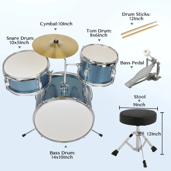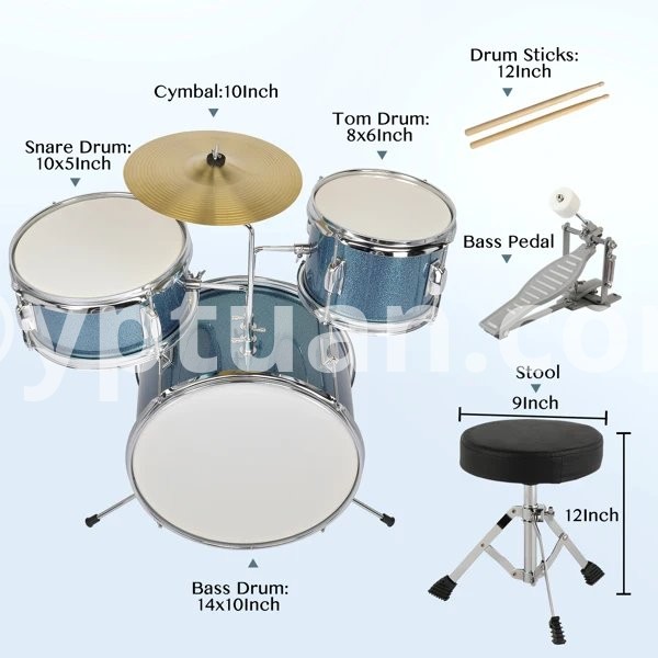 Introductions: Is your Kids going to take part in a grand festival performance? Or are you looking for a reliable musical instrument to train your talented kid? Our 14"x10" 3-Pieces Junior Kids Child Drum Set Kit Pedal Drum Stick Wrench Drum Stool must be his/her best partner on the journey of music! This snare drum set is smaller than the professional one and great for saving space. With the strap provided, it's also easy to carry. A perfect gift for your gifted kid and I believe he or she will spend happy time with this drum set! Features: Made of durable metal material Two pair of drumsticks, a wrench and a strap are included Smaller than the professional one and great for saving space With the strap provided, it's also easy to carry Bright and beautiful sound A perfect gift and music instrument for your gifted and musically talented kid The drum shell is made of horizontal-grained poplar wood, with high strength, uniform vibration and loud sound. Specifications: Material: Metal Color: Sky Blue Bass Drum Sizes: 14" x 10" Tom-Tom Drum Sizes: 8" x 6" Snare Drum Sizes: 10" x 5" Cymbal Size: 10" Package Includes: 1x Bass Drum 1 x Tom-Tom Drum 1 x Snare Drum 2 x Pair of Drum Dtick 1 x Pedal 1 x Drum Stool 1 x Screw Wrench 1 x Cymbal